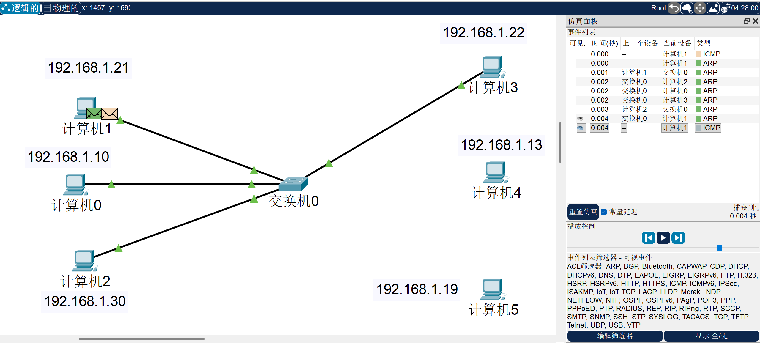 我们从 计算机1 向 计算机2 发一个包,我们的ARP不断发发发,然后到 计算机2 回给交换机0 的时候,我们再做一步,就会发现跟网桥一样,我们的交换机只会把 计算机2 回的ARP回给 计算机1,而不会再次广播到 计算机0/3。