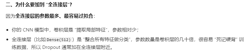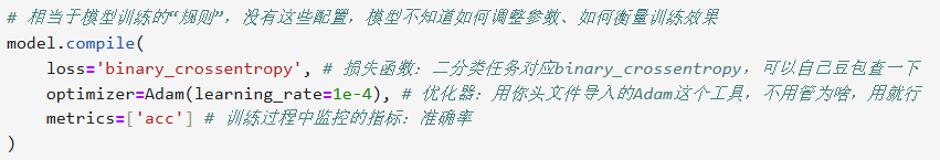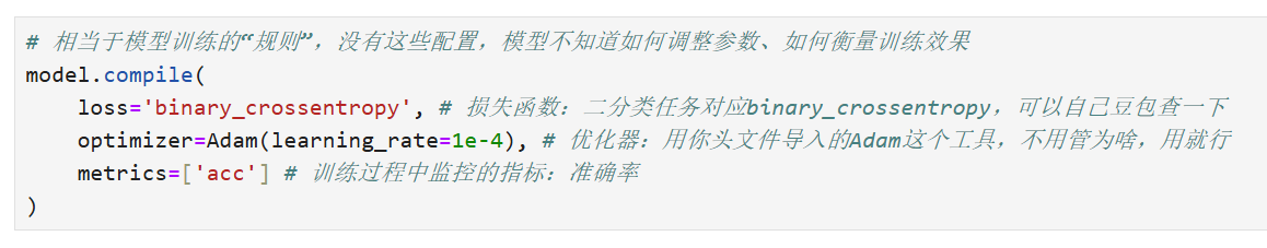 # 相当于模型训练的“规则”,没有这些配置,模型不知道如何调整参数、如何衡量训练效果 model.compile( loss='binary_crossentropy', # 损失函数:二分类任务对应binary_crossentropy,可以自己豆包查一下 optimizer=Adam(learning_rate=1e-4), # 优化器:用你头文件导入的Adam这个工具,不用管为啥,用就行 metrics=['acc'] # 训练过程中监控的指标:准确率 )2、调用【训练函数】开始训练