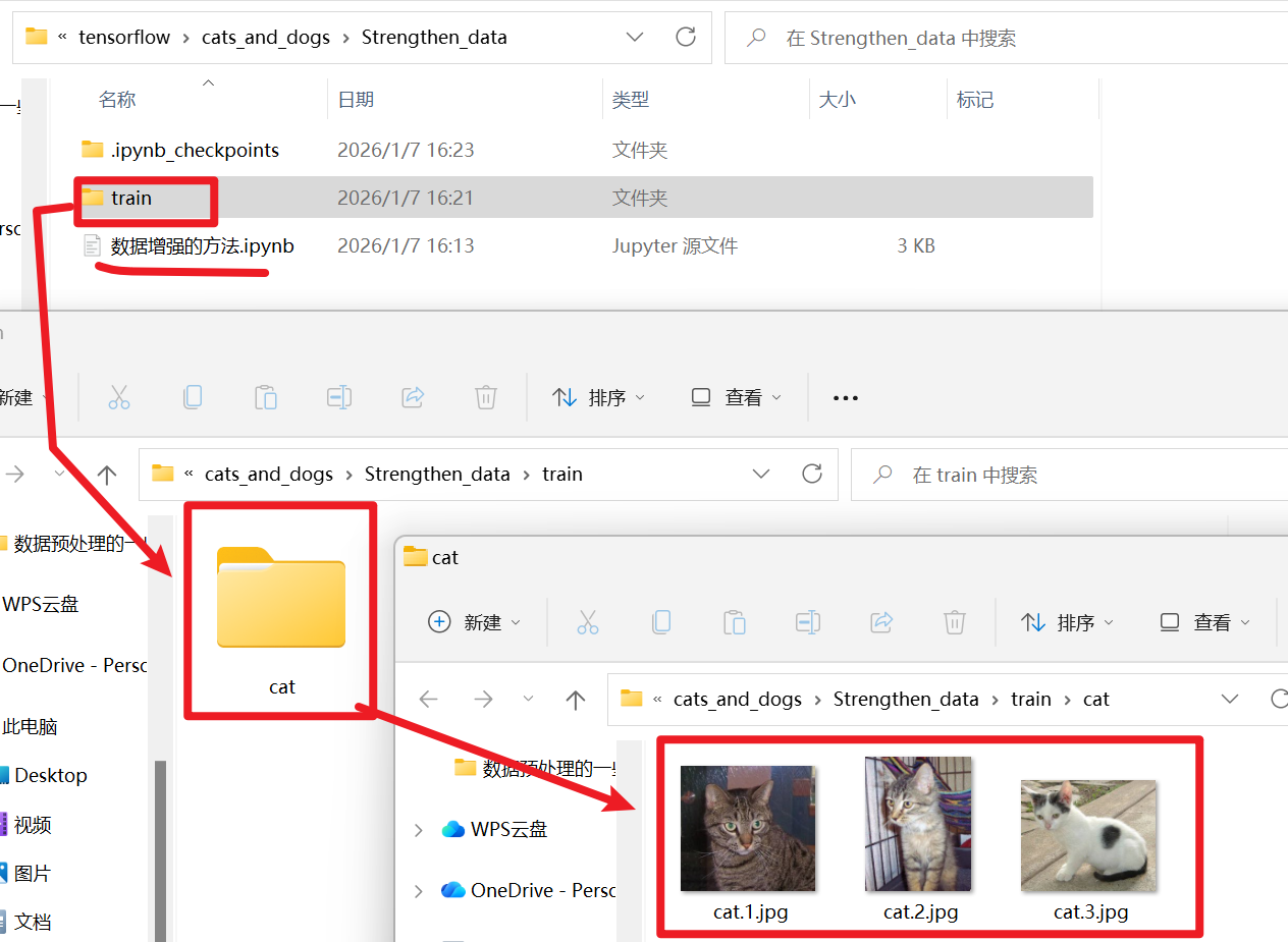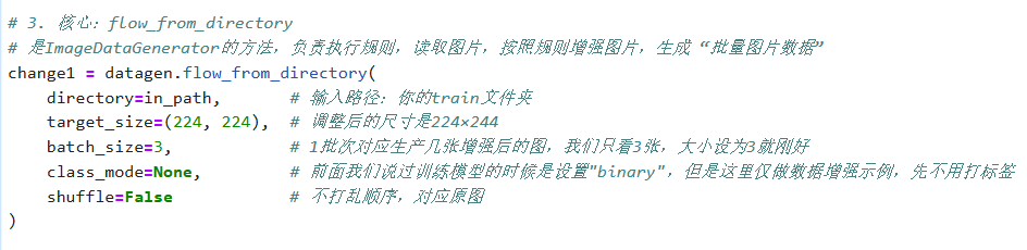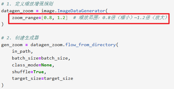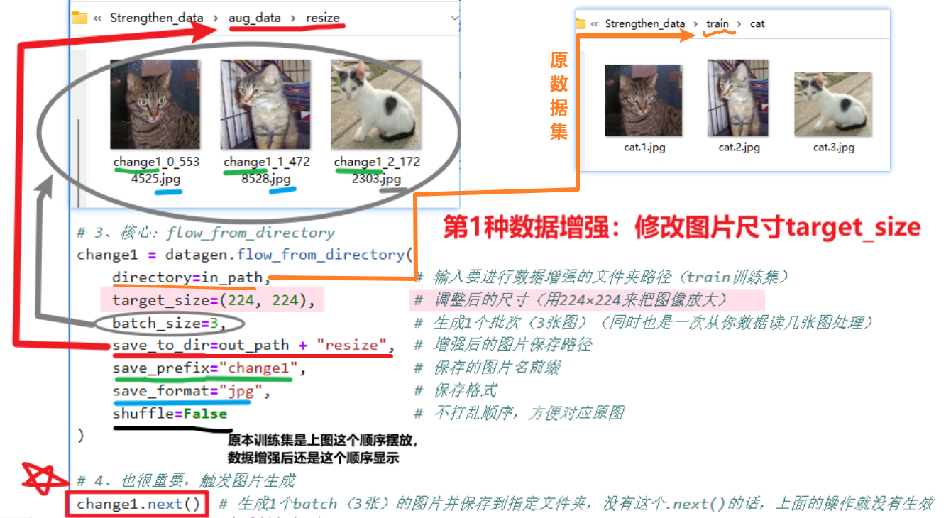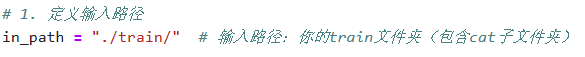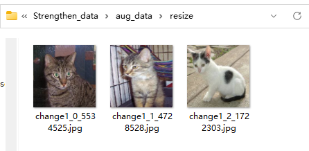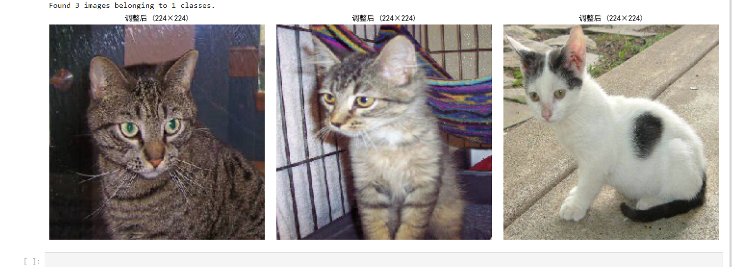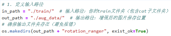 # 1、定义输入/输出路径(关键:和示例的in_path/out_path对应) in_path = "./train/" # 输入路径:你的train文件夹(包含cat子文件夹) out_path = "./aug_data/" # 输出路径:增强后的图片保存位置 # 确保输出文件夹存在(避免报错) os.makedirs(out_path + "resize", exist_ok=True) # 2、初始化ImageDataGenerator(先只做resize,后续可加其他增强) # 必须做的【归一化】,依旧是把像素值从0~255压缩到0~1(其他参数既然不设,就可以设为0或者先不写) datagen = image.ImageDataGenerator(rescale=1./255) # 3、核心:flow_from_directory change1 = datagen.flow_from_directory( directory=in_path, # 输入要进行数据增强的文件夹路径(train训练集) target_size=(224, 224), # 调整后的尺寸(用224×224来把图像放大) batch_size=3, # 生成1个批次(3张图)(同时也是一次从你数据读几张图处理) save_to_dir=out_path + "resize", # 增强后的图片保存路径 save_prefix="change1", # 保存的图片名前缀 save_format="jpg", # 保存格式 shuffle=False # 不打乱顺序,方便对应原图 ) # 4、也很重要,触发图片生成 change1.next() # 生成1个batch(3张)的图片并保存到指定文件夹,没有这个.next()的话,上面的操作就没有生效 print(f"✅ 图片已生成并保存到:{out_path}resize/")