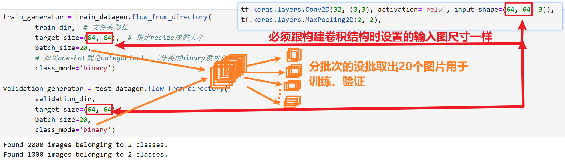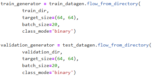 train_generator = train_datagen.flow_from_directory( train_dir, # 文件夹路径 target_size=(64, 64), # 指定resize成的大小 batch_size=20, # 如果one-hot就是categorical,二分类用binary就可以 class_mode='binary') validation_generator = test_datagen.flow_from_directory( validation_dir, target_size=(64, 64), batch_size=20, class_mode='binary')