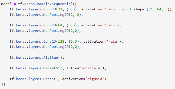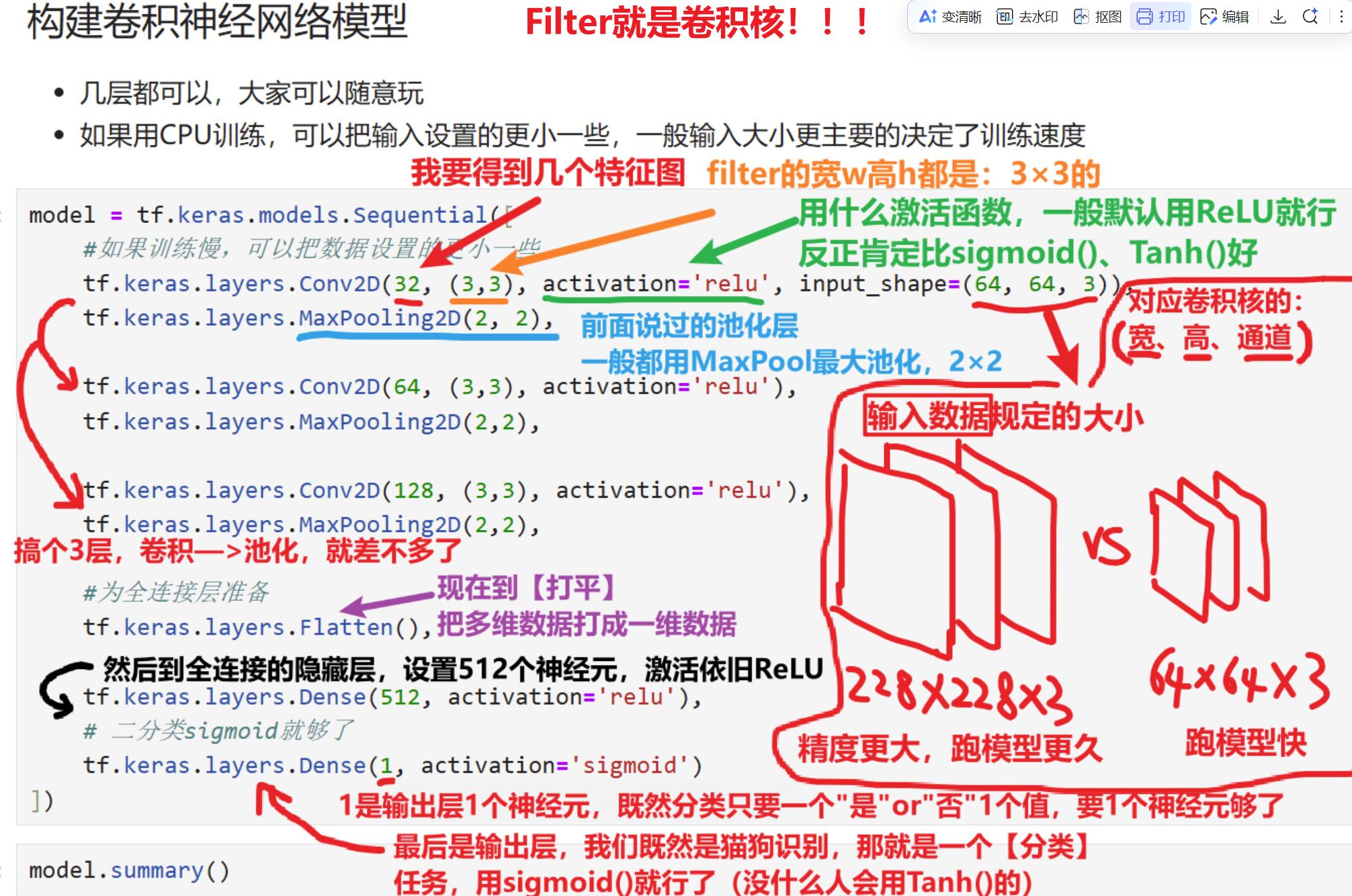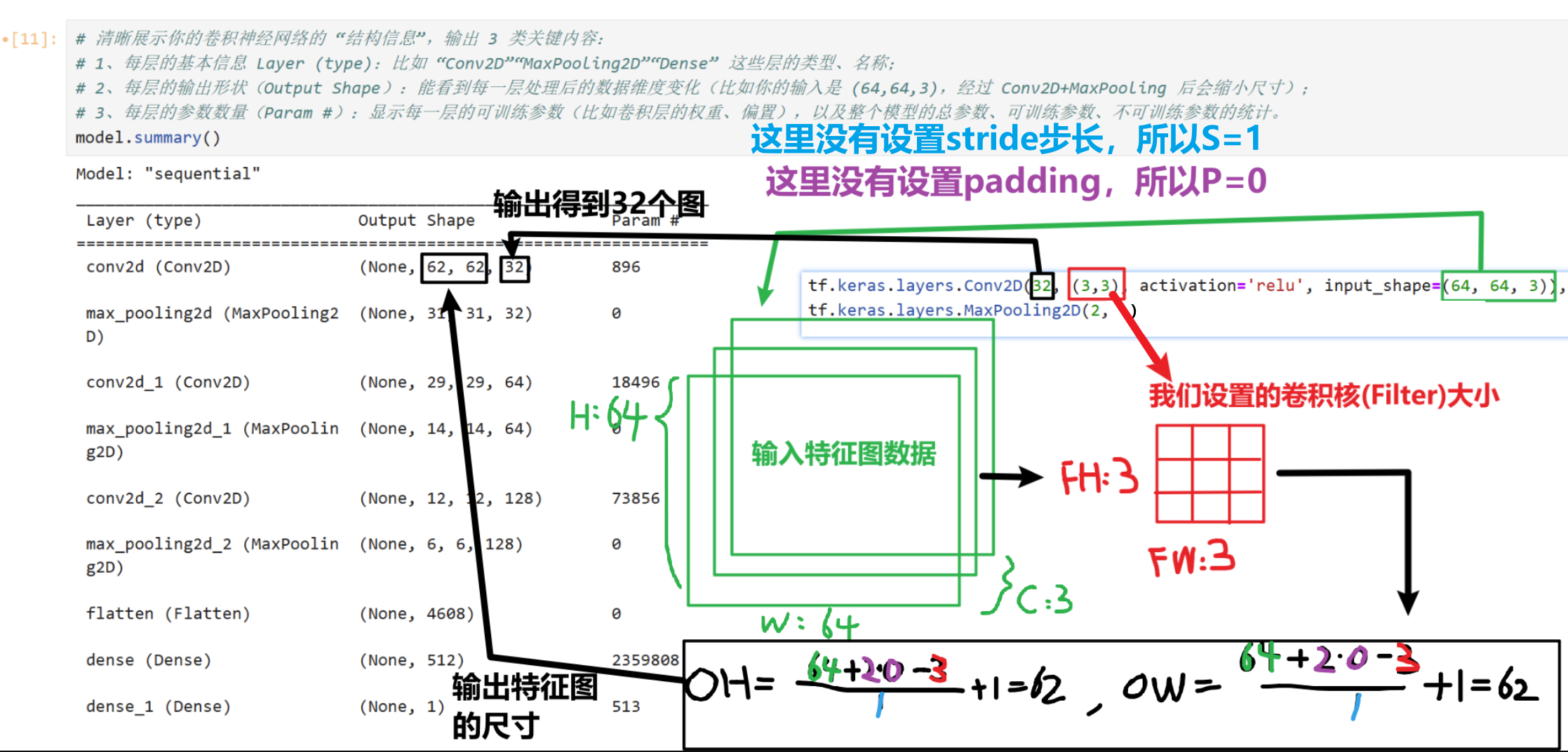 # 每次要写的时候直接复制就行,有自己想改的参数再一点点改 model = tf.keras.models.Sequential([ #如果训练慢,可以把数据设置的更小一些 tf.keras.layers.Conv2D(32, (3,3), activation='relu', input_shape=(64, 64, 3)), tf.keras.layers.MaxPooling2D(2, 2), tf.keras.layers.Conv2D(64, (3,3), activation='relu'), tf.keras.layers.MaxPooling2D(2,2), tf.keras.layers.Conv2D(128, (3,3), activation='relu'), tf.keras.layers.MaxPooling2D(2,2), #为全连接层准备 tf.keras.layers.Flatten(), tf.keras.layers.Dense(512, activation='relu'), # 二分类sigmoid就够了 tf.keras.layers.Dense(1, activation='sigmoid') ])然后我们输入一下【model.summary()】代码:来看看我们设置的卷积神经网络结构符不符合我们的想要的结构