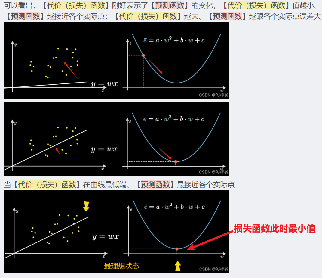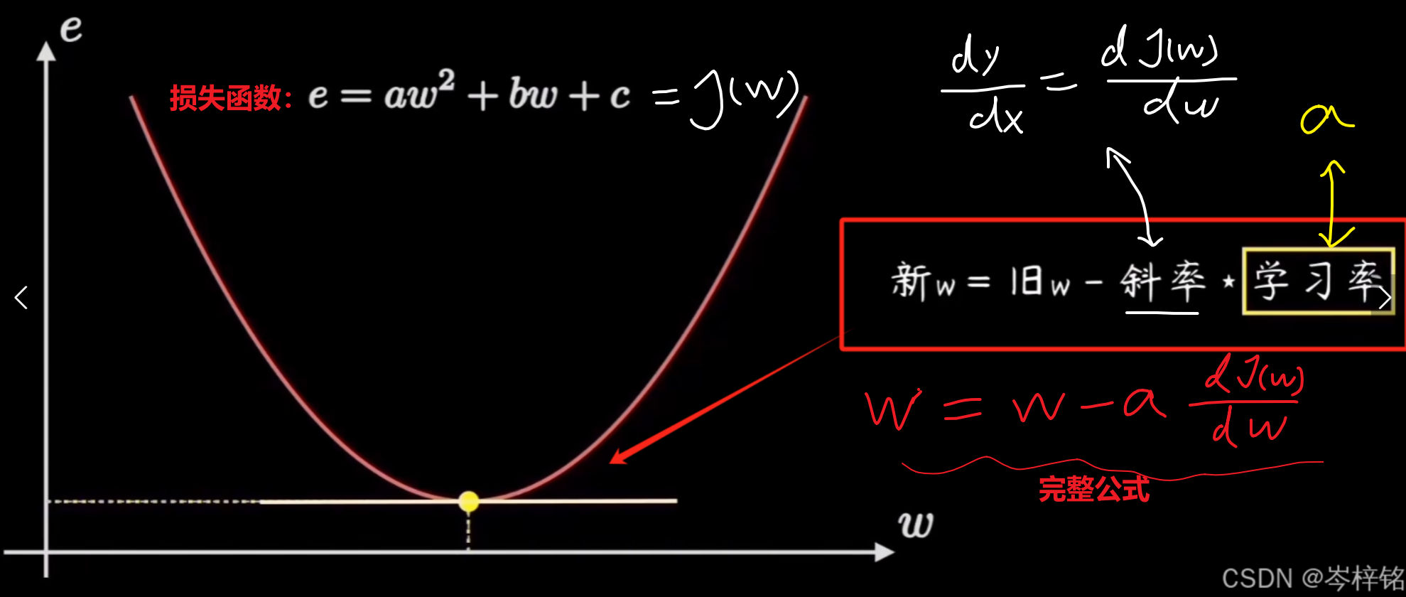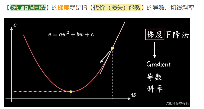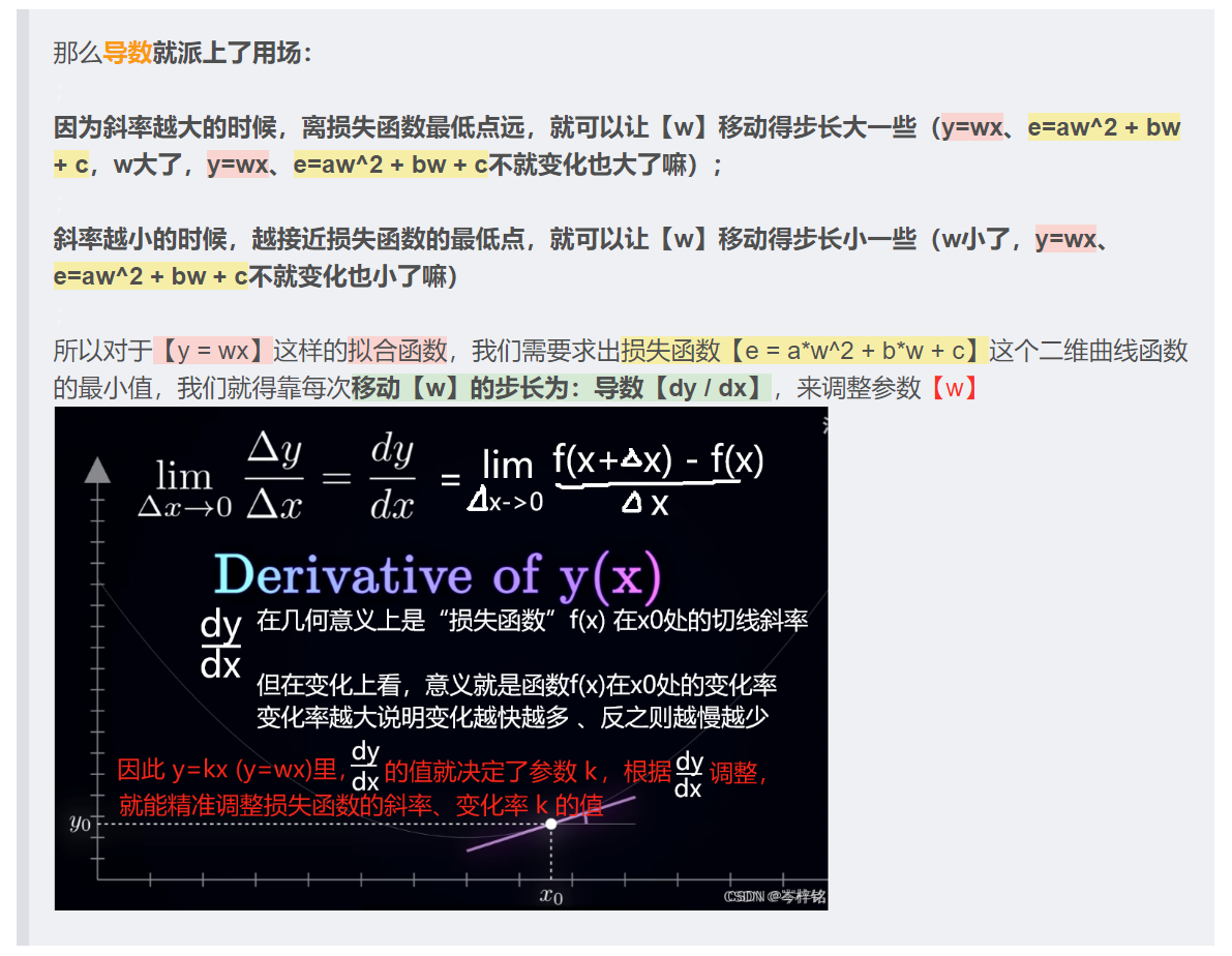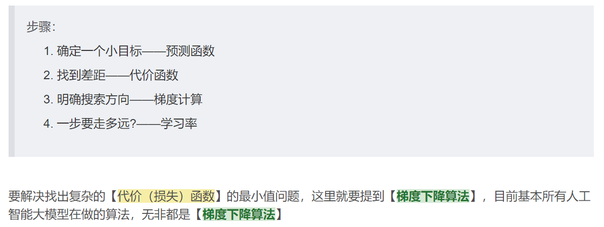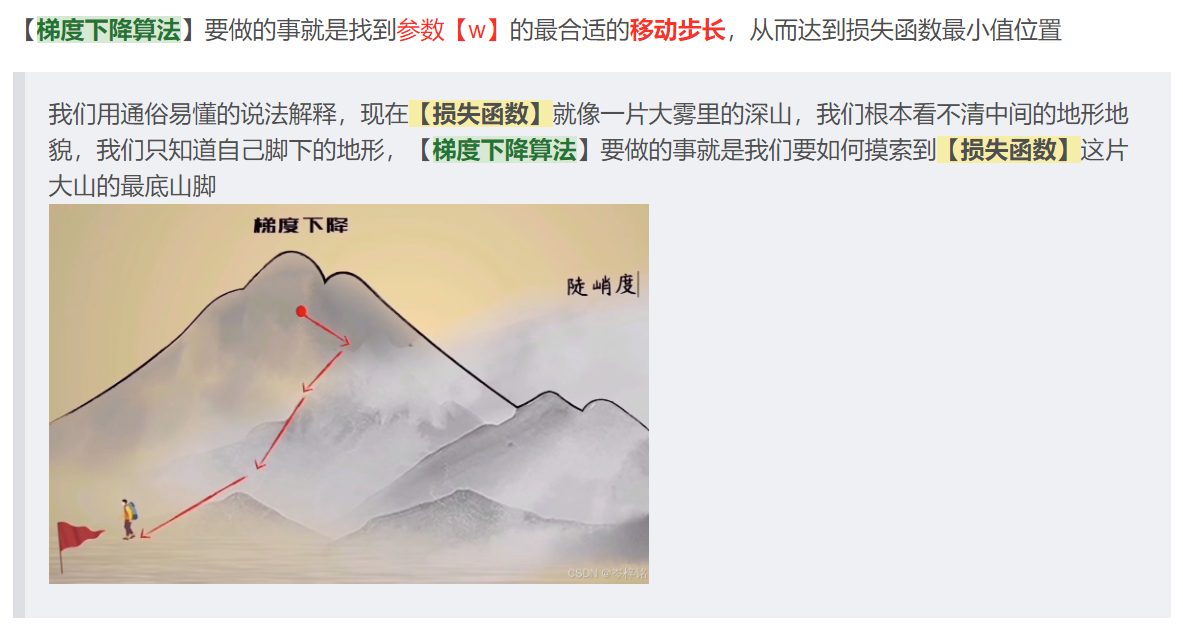- 而损失函数怎么才能达到完美没人知道,也没有公式一步得到,所以只能调整损失函数里的参数【w】和【b】,也可以叫他们是步长,每一步要调多少才能让损失函数的值最小?