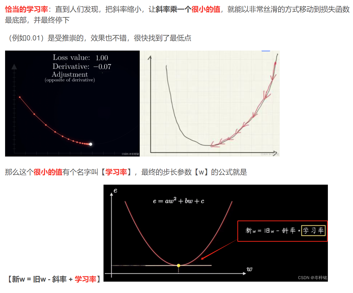 - 其中学习率a也得是一个人为手动设的一个很小的值,若a设置的刚刚好的话就能求出一个完美的参数w和b步长,让损失函数值以很丝滑平稳的节奏速度降到最低,也就是损失函数斜率接近0的地方(变化率最小,损失函数变化、斜率 最平稳)