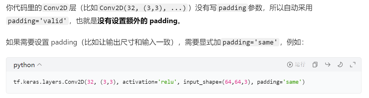 - 注意我这里没写【padding】和【stride】两个参数,所以使用【默认的padding=0】、【stride=1】,如果要写的话参照下面代码