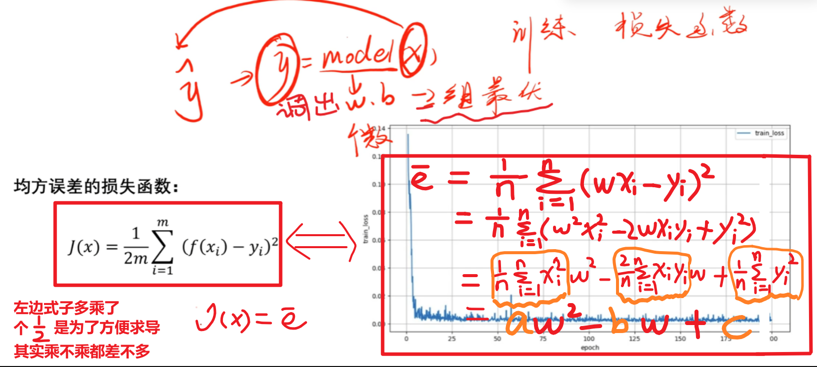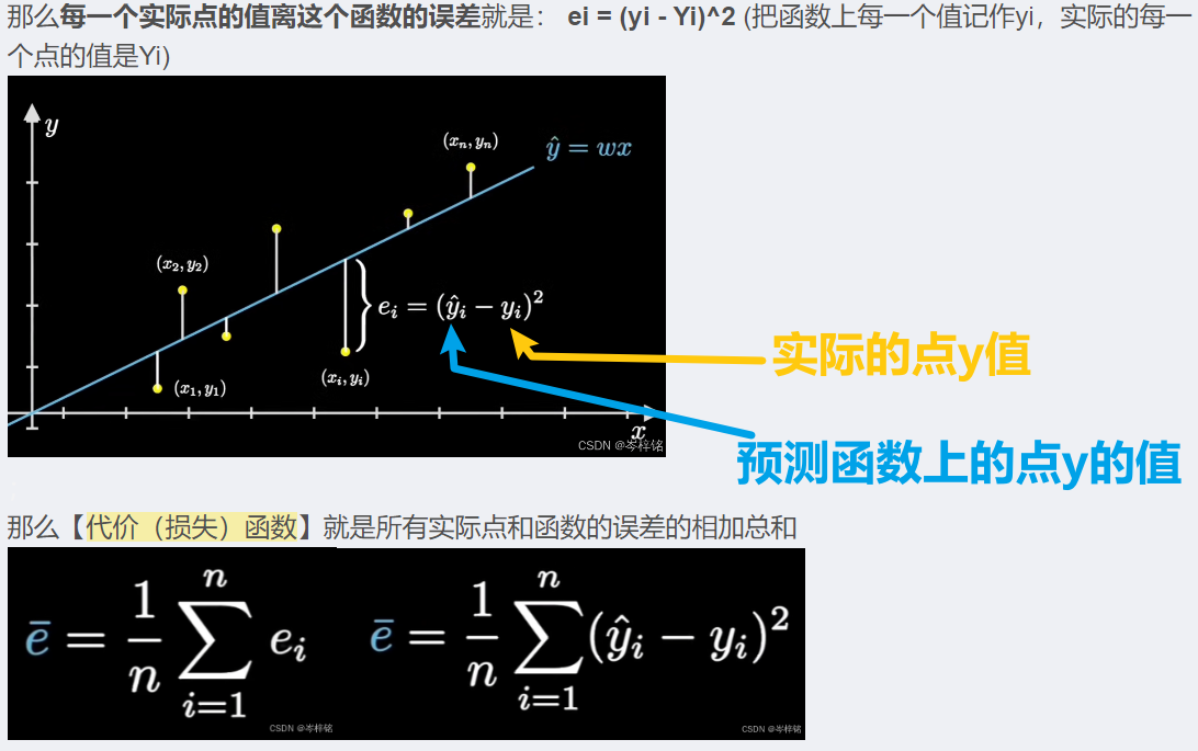 简单理解就是求【模型函数每个点 和 实际点 之间的差别的平均和】,考虑到负数正数相加会出现0的情况,所以采用平方的形式来把负数变成正数,整体所有的值都平方