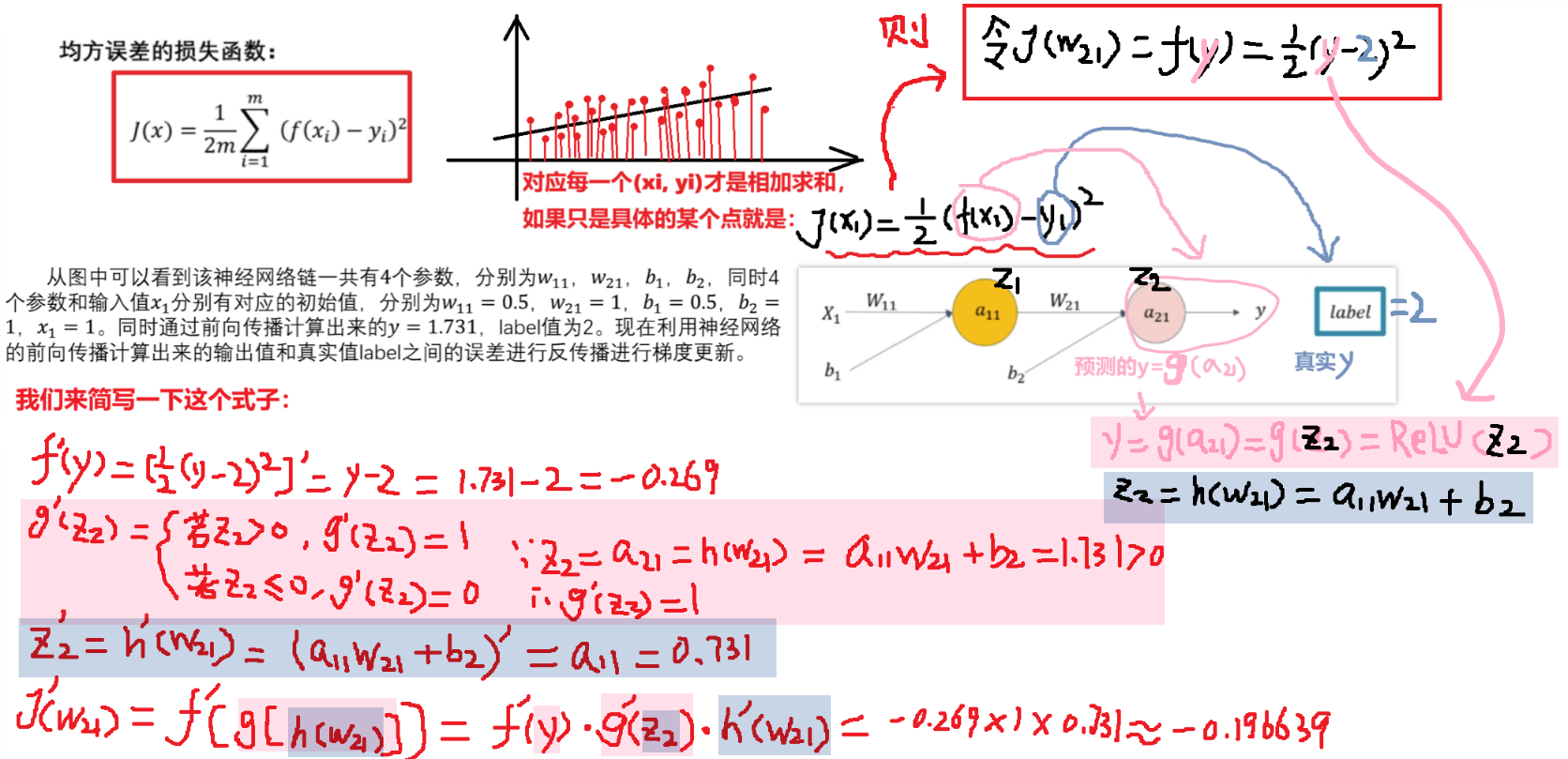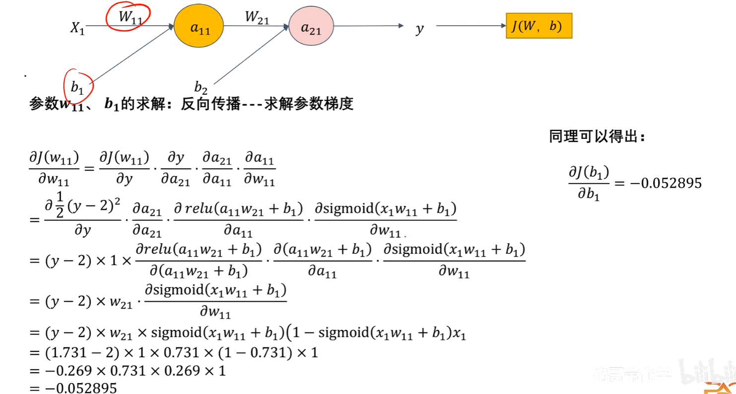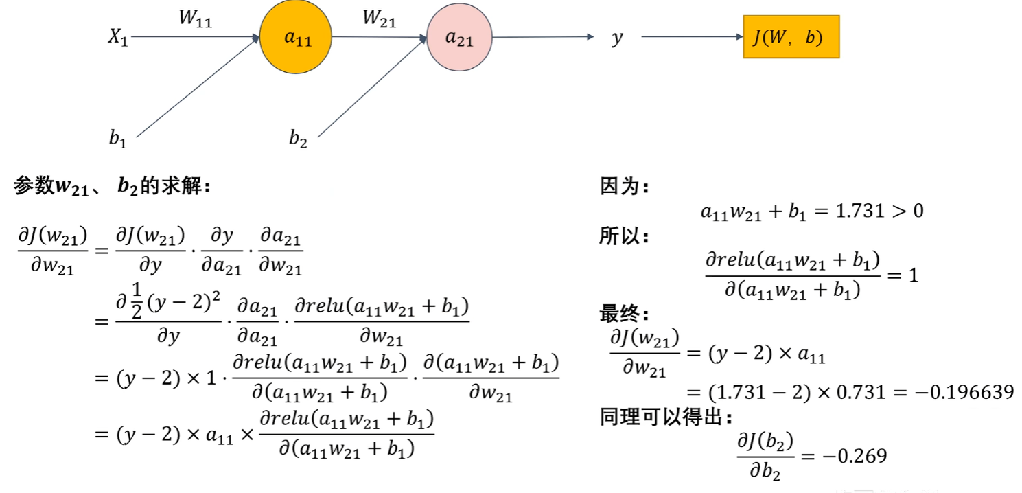 我们可以把【损失函数J(w)写成 J(w) = f(y)】更方便理解,而【y又等于a12这一个神经元的输出】、【a12又等于一个激活函数例如ReLU(h(x))】、【h(x)又是一个拟合函数a11*w21+b2】,所以J( w ) = f( y ) = f( a12 ) = f( ReLu( h(x) ) ) = f( ReLu( a11*w21+b2 ) )类似这样的一个复合函数形式!!!反向传播就是要对每一层神经元的这样的复合函数求导!!!!!(J(b)也是一样,J(w)、J(b)都是根据输出的预测值y求得的损失函数,然后调整参数w、b)