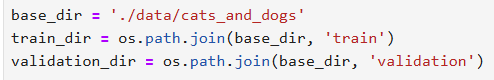 - 2、我前面强调过,数据增强还是用【flow_from directory()函数】,它指定的数据集路径只用到【train】、【test】、【validation】这些路径,然后他会到这些路径的下一层去分别读取“cat”、“dog”.......这种子文件夹的数据,一定要保证是【train / 种类A / xxx.jpg】这样的层级关系