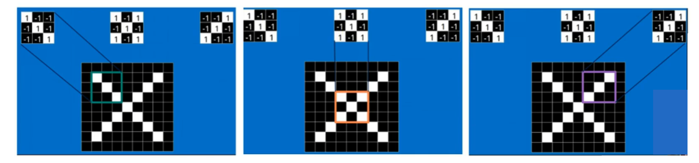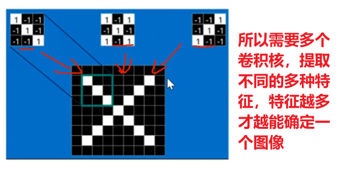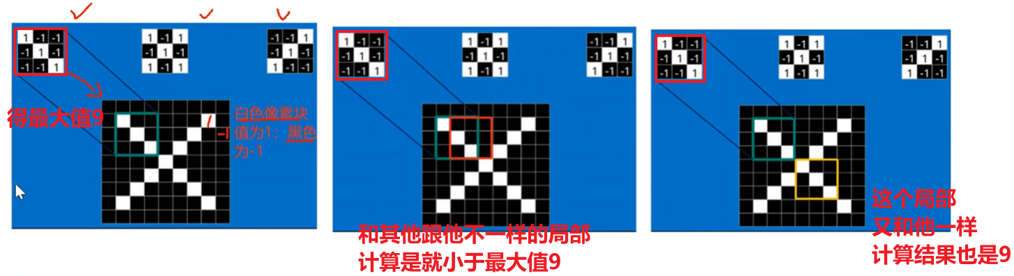 一个卷积核是电脑随机生成的一个矩阵值,比如下图的左上角第一个卷积核,他刚好对于捕捉【字母X的左上角、右下角】的特征,那么判断的依据就是【二维卷积计算的值是不是最大值】!!!
