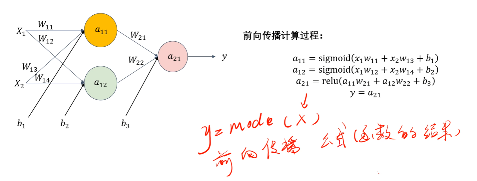有了上面的知识点后,我们就可以知道啥是【前向传播】了,简单说:【前向传播】就是 “输入数据→用前面层的输出当当前层的输入→逐层算到输出” 的过程,每一步都要做 “线性计算 + 激活函数” 的运算。知道这么个意思就够了
