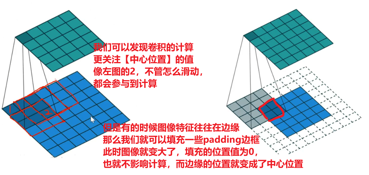 看下图可以理解,padding不仅可以调节输入图像尺寸、featuremap与输出尺寸以外,还可以兼顾到图像边缘的特征值提取