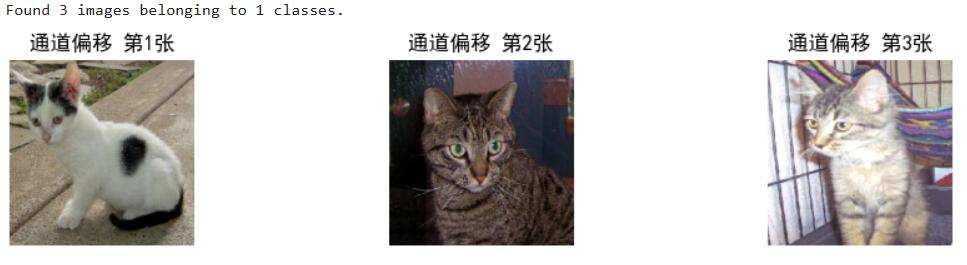 # 通用参数(所有增强共用) in_path = "./train/" # 你的train文件夹路径 target_size = (224, 224) # 统一调整为224×224 batch_size = 1 # 每次生成1张,方便拼接3张 # 1. 定义通道偏移增强规则 datagen_channel = image.ImageDataGenerator( channel_shift_range=50 # 通道偏移强度:数值越大,颜色变化越明显(0~255) ) # 2. 创建生成器 gen_channel = datagen_channel.flow_from_directory( in_path, batch_size=batch_size, class_mode=None, shuffle=True, target_size=target_size ) # 3. 获取3张通道偏移后的图片数据 np_channel = np.concatenate([gen_channel.next() for i in range(3)]) # 4. 拼接成一行展示效果 plt.figure(figsize=(10, 2)) for i in range(3): plt.subplot(1, 3, i+1) plt.imshow(np_channel[i].astype('uint8')) plt.title(f"通道偏移 第{i+1}张") plt.axis('off') plt.tight_layout() plt.show()