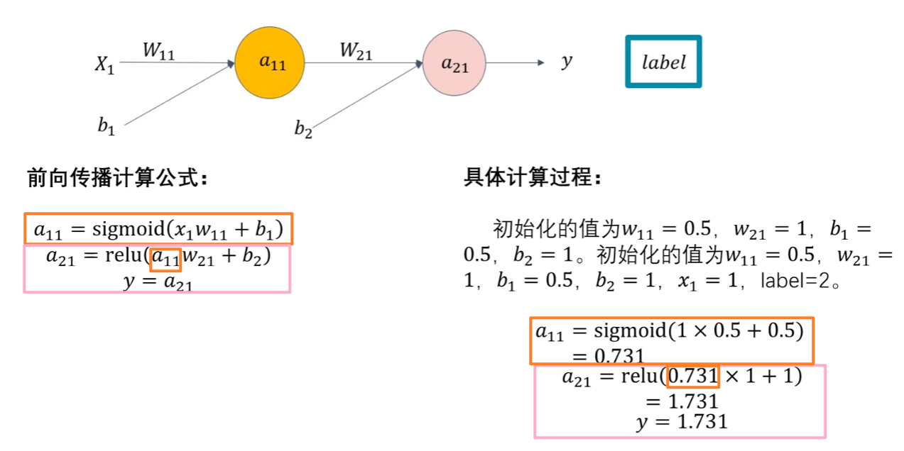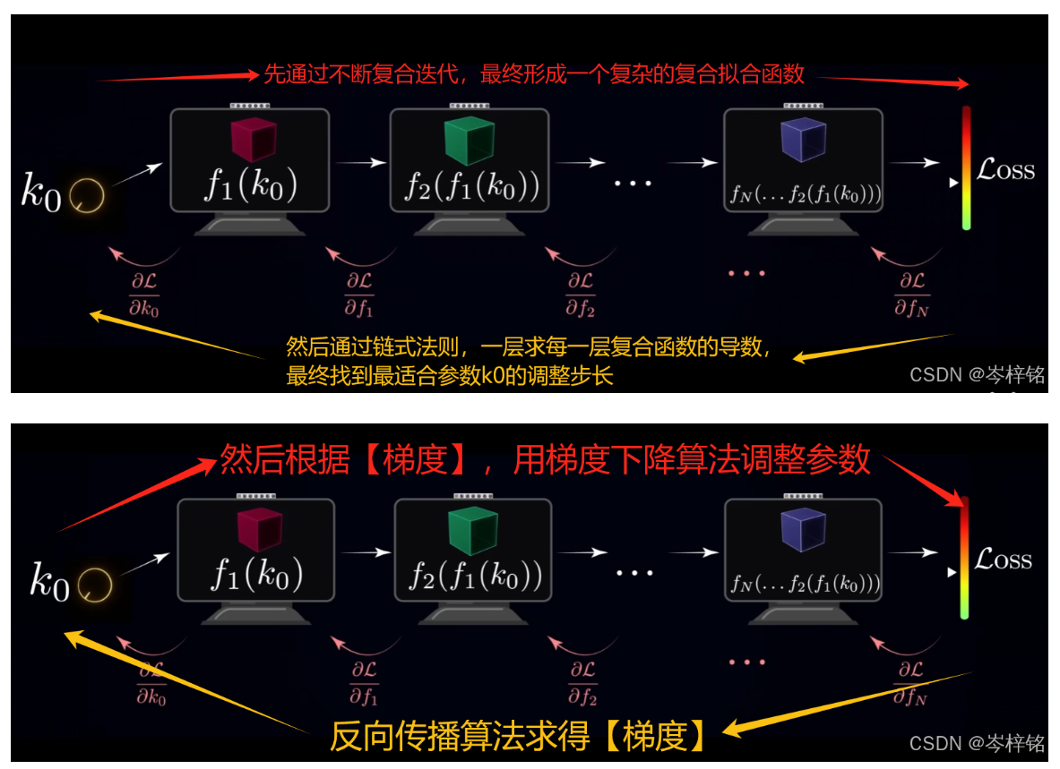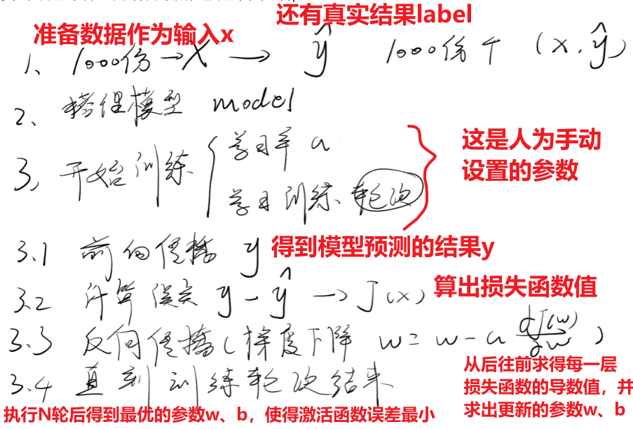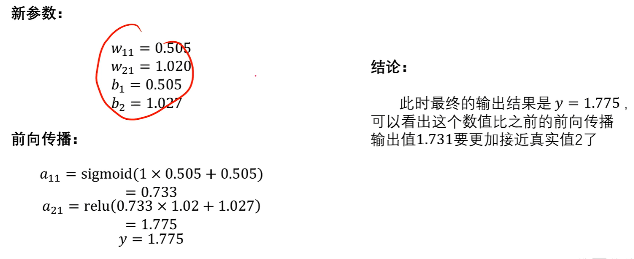 然后再回到开头,用这些新参数进行【前向传播】,再次比较输出的【预测值y】和【真实值label】的差别,也就是【损失函数的值】,以此类推