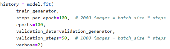 # 把 fit_generator 改成 fit history = model.fit( # 仅改这一个函数名 train_generator, steps_per_epoch=100, # 2000 images = batch_size * steps epochs=20, validation_data=validation_generator, validation_steps=50, # 1000 images = batch_size * steps verbose=2)但是留意:模型可能会发生【过拟合】