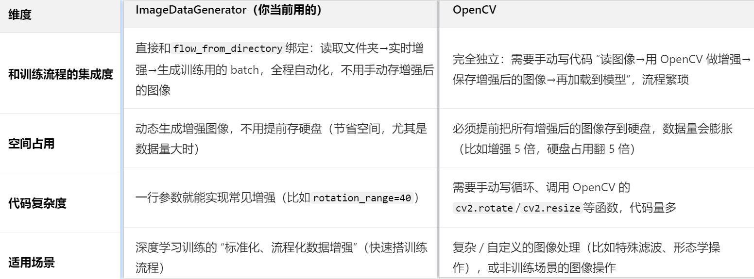 那么就有人会想到最常用的图像处理工具————【opencv】,但是我们的【tensorflow库的Keras】已经集成了内置非常强大的图像处理工具:【ImageDataGenerator】,为什么用它而不用【opencv】呢?——————一句话:图省事,没有那么多自定义需求要操作(Keras只用一两句代码,opencv要自己手写一堆)