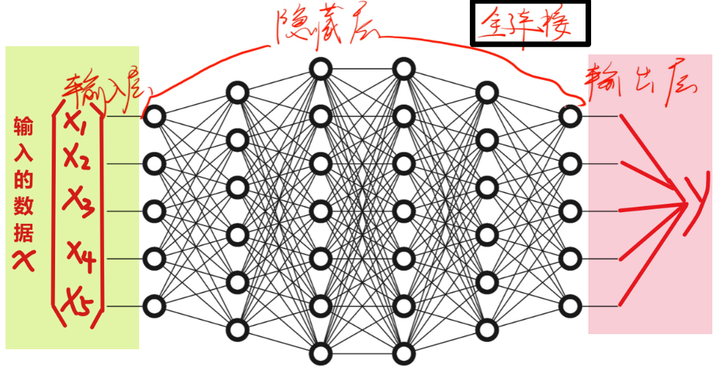 有了“神经元”,我们就可以通过叠加多层【拟合函数】和【激活函数】组合成一个庞大的神经网络了,一个宏观全连接神经网络的大致里截图如下所示,包含了【输入层】、【隐藏层】、【输出层】