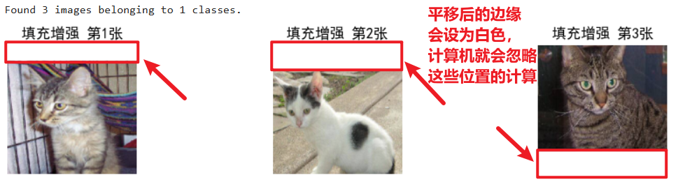 # 通用参数(所有增强共用) in_path = "./train/" # 你的train文件夹路径 target_size = (224, 224) # 统一调整为224×224 batch_size = 1 # 每次生成1张,方便拼接3张 # 1. 定义填充增强规则(先平移,再填充空白) datagen_fill = image.ImageDataGenerator( width_shift_range=0.3, # 大幅水平平移,制造空白区域 fill_mode='constant', # 填充模式:constant(固定颜色)、nearest(邻近像素)、reflect(反射) cval=255 # 填充颜色:constant模式下,用白色(255)填充空白 ) # 2. 创建生成器 gen_fill = datagen_fill.flow_from_directory( in_path, batch_size=batch_size, class_mode=None, shuffle=True, target_size=target_size ) # 3. 获取3张填充后的图片数据 np_fill = np.concatenate([gen_fill.next() for i in range(3)]) # 4. 拼接成一行展示效果 plt.figure(figsize=(10, 2)) for i in range(3): plt.subplot(1, 3, i+1) plt.imshow(np_fill[i].astype('uint8')) plt.title(f"填充增强 第{i+1}张") plt.axis('off') plt.tight_layout() plt.show()