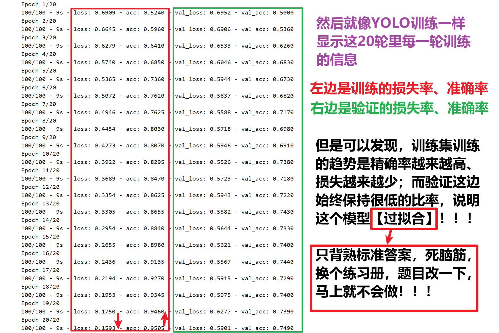 就是模型只读训练集的学习滚瓜烂熟,但是对验证、预测的效果很差,过度依赖了训练集,这也很可能是我之前训练YOLO模型时老是效果很差的原因,所以要关注一下怎么解决