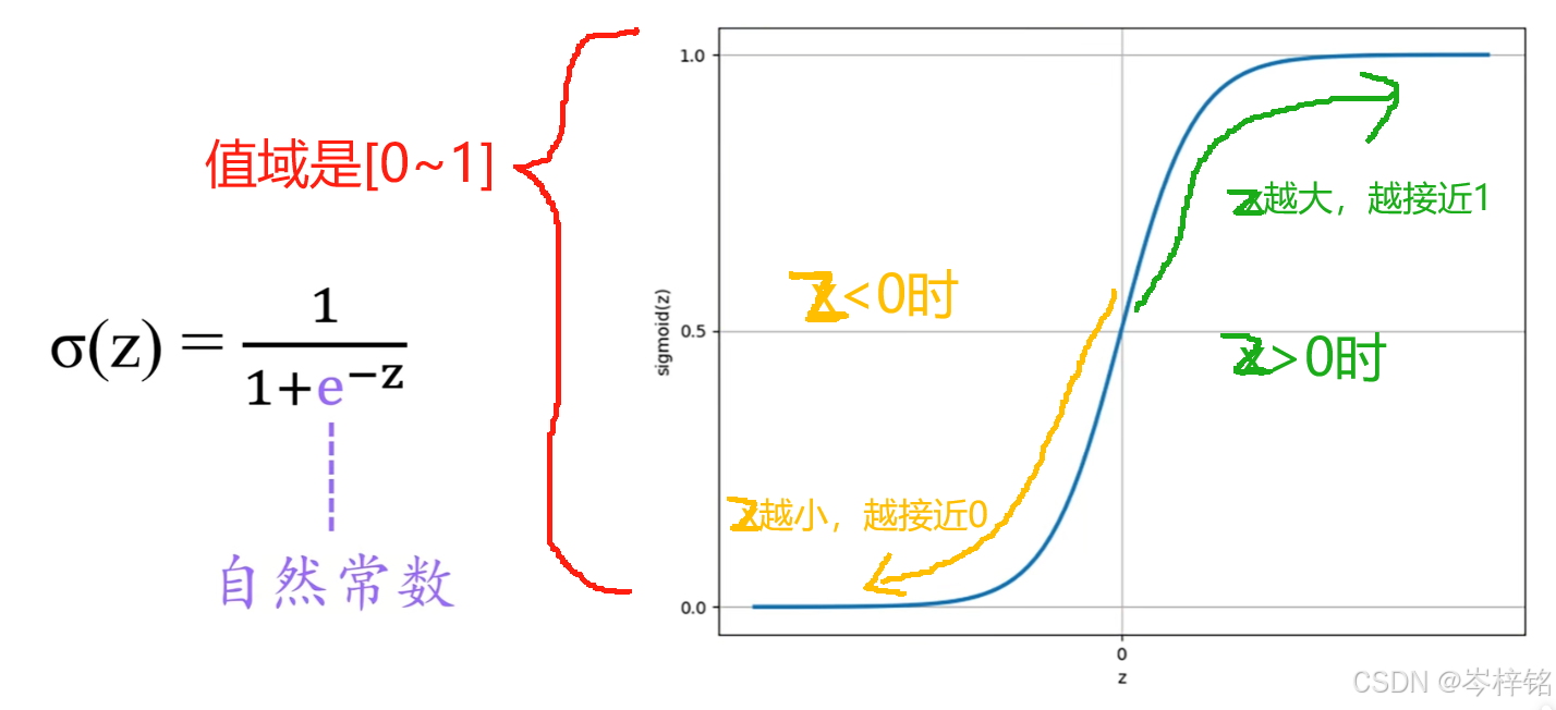 - z越大,e^-z越趋近于0,分母就越趋近于1,整体函数值就越趋近于1;