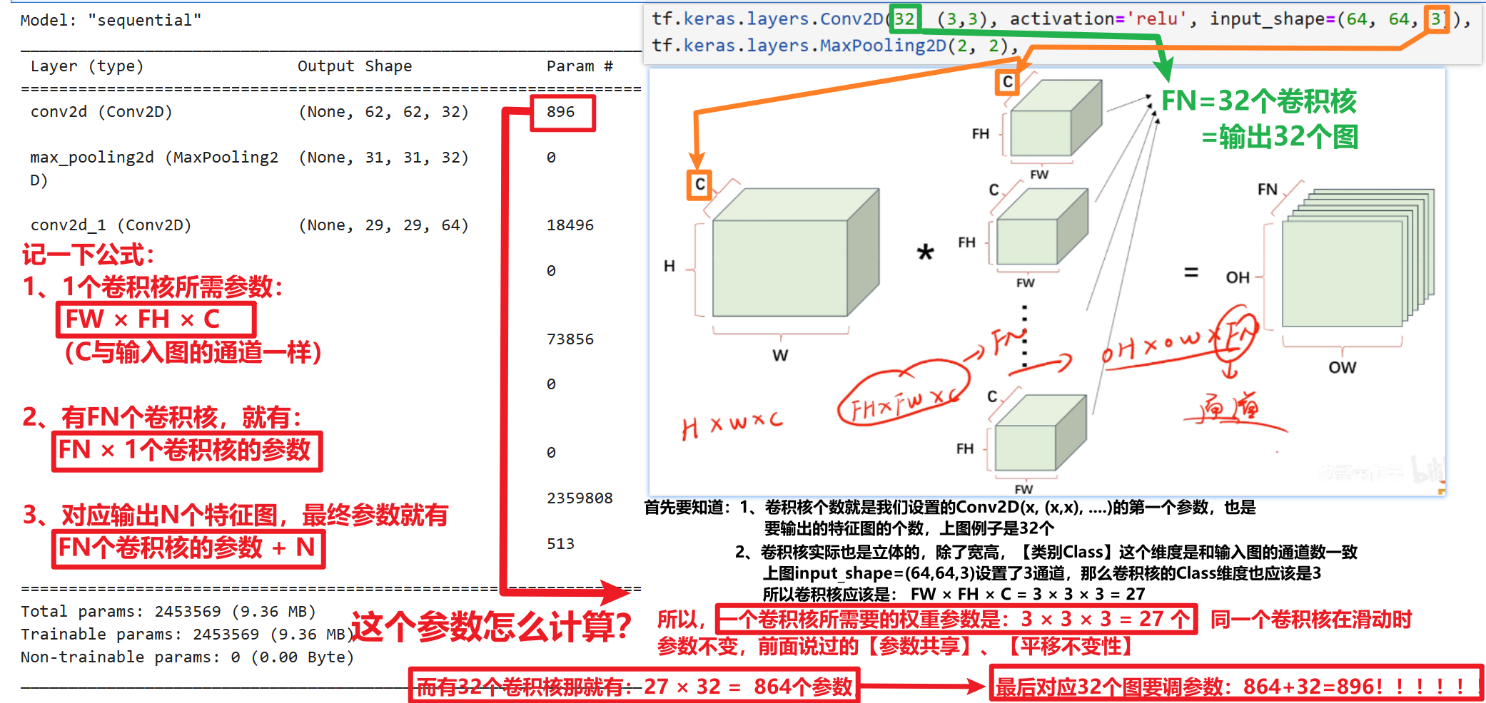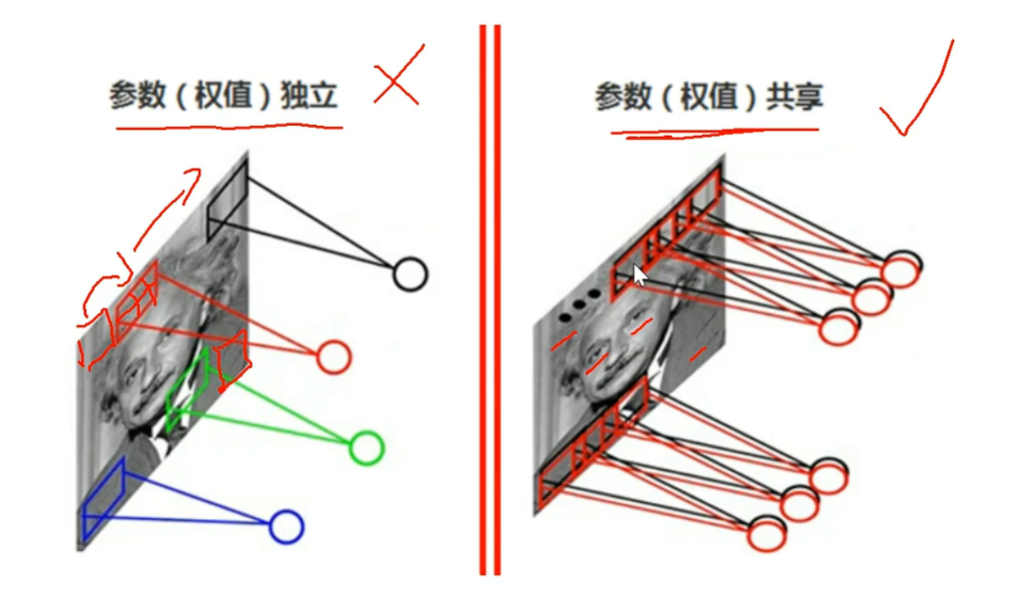 然后记住,卷积的一个特性是【参数共享】,也是【平移不变性】,是为了模仿人类在变换视角的时候对图像特征的捕捉保持不变。当然这里要补充一个知识点:【1个卷积核只进行1种特征值提取】,比如一个卷积核负责提取【眼睛】这个特征,那么从图像头滑动到最尾,它的一切获取的值都是在为认识【眼睛】而服务,具体怎么做后面讲