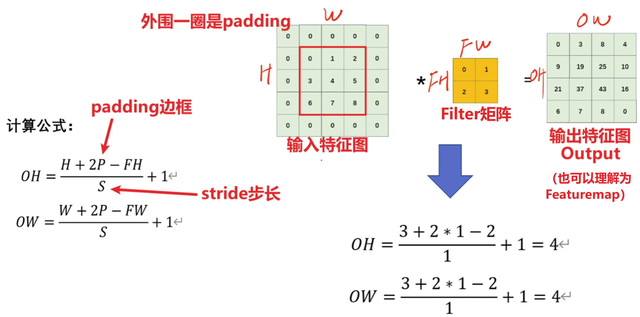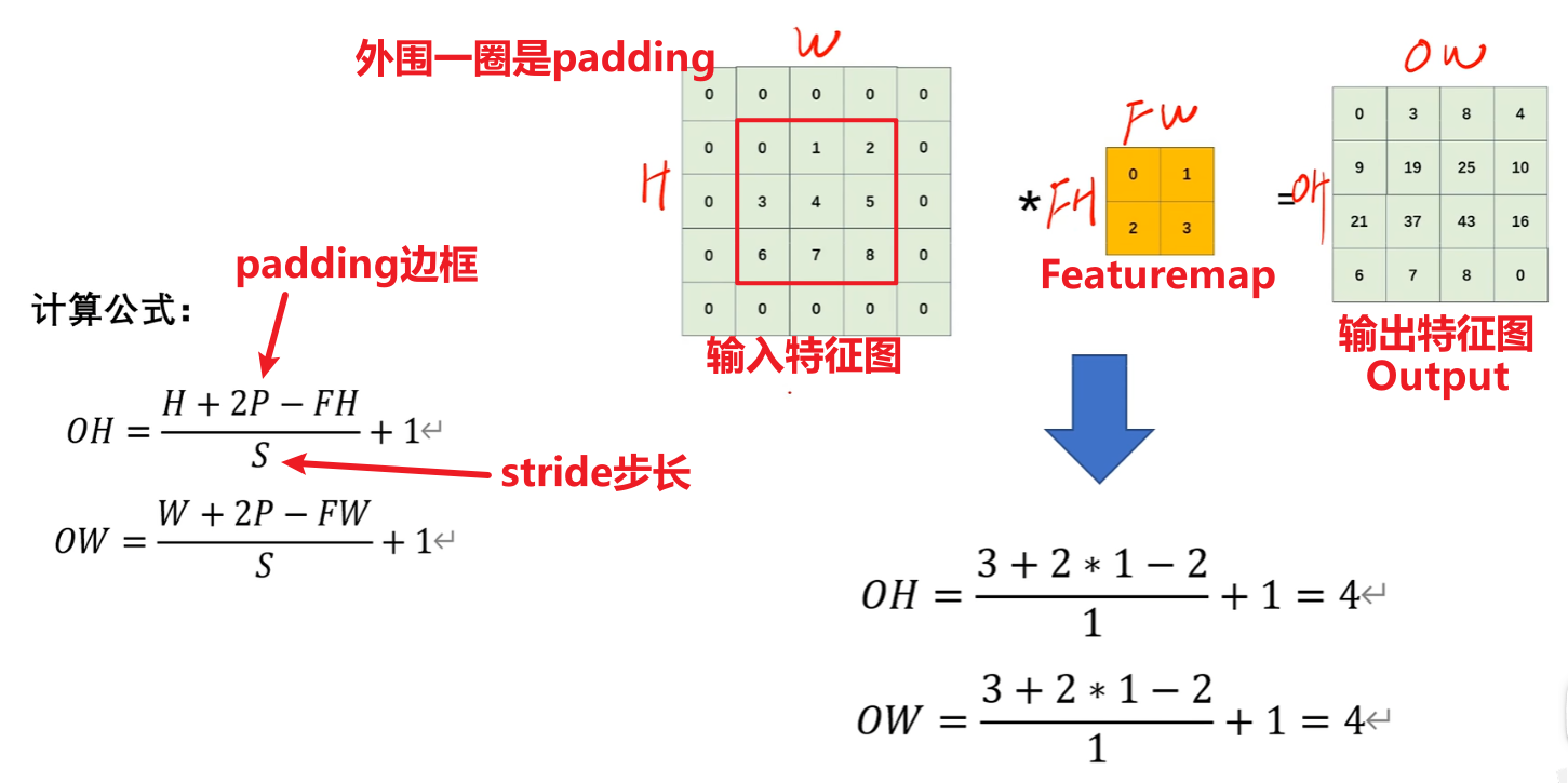 - 还有我们提过的【非常重要的:根据输入特征图计算输出特征图尺寸公式】