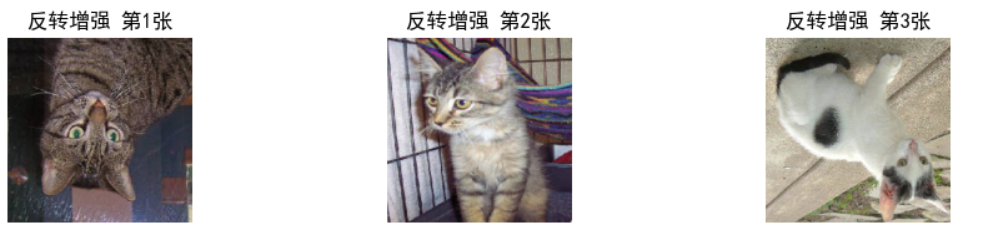 # 通用参数(所有增强共用) in_path = "./train/" # 你的train文件夹路径 target_size = (224, 224) # 统一调整为224×224 batch_size = 1 # 每次生成1张,方便拼接3张 # 1. 定义反转增强规则 datagen_flip = image.ImageDataGenerator( horizontal_flip=True, # 随机水平反转(左右翻转) vertical_flip=True # 随机垂直反转(上下翻转) ) # 2. 创建生成器 gen_flip = datagen_flip.flow_from_directory( in_path, batch_size=batch_size, class_mode=None, shuffle=True, target_size=target_size ) # 3. 获取3张反转后的图片数据 np_flip = np.concatenate([gen_flip.next() for i in range(3)]) # 4. 拼接成一行展示效果 plt.figure(figsize=(10, 2)) for i in range(3): plt.subplot(1, 3, i+1) plt.imshow(np_flip[i].astype('uint8')) plt.title(f"反转增强 第{i+1}张") plt.axis('off') plt.tight_layout() plt.show()
