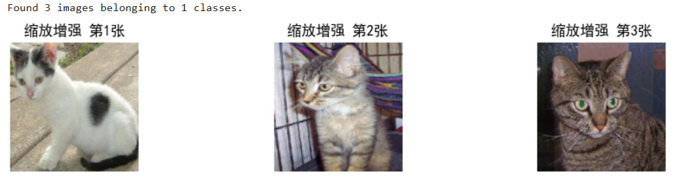 # 通用参数(所有增强共用) in_path = "./train/" # 你的train文件夹路径 target_size = (224, 224) # 统一调整为224×224 batch_size = 1 # 每次生成1张,方便拼接3张 # 1. 定义缩放增强规则 datagen_zoom = image.ImageDataGenerator( zoom_range=[0.8, 1.2] # 缩放范围:0.8倍(缩小)~1.2倍(放大) ) # 2. 创建生成器 gen_zoom = datagen_zoom.flow_from_directory( in_path, batch_size=batch_size, class_mode=None, shuffle=True, target_size=target_size ) # 3. 获取3张缩放后的图片数据 np_zoom = np.concatenate([gen_zoom.next() for i in range(3)]) # 4. 拼接成一行展示效果 plt.figure(figsize=(10, 2)) for i in range(3): plt.subplot(1, 3, i+1) plt.imshow(np_zoom[i].astype('uint8')) plt.title(f"缩放增强 第{i+1}张") plt.axis('off') plt.tight_layout() plt.show()