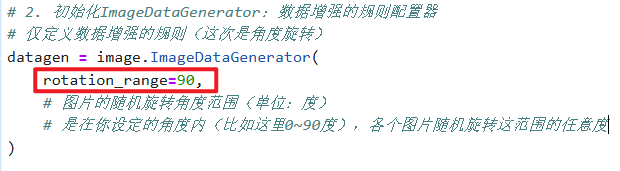 只不过把第2步【ImageDataGenerator】的规则参数设为【旋转角度:rotation_range=?】