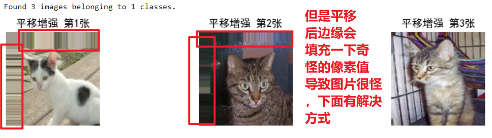 # 通用参数(所有增强共用) in_path = "./train/" # 你的train文件夹路径 target_size = (224, 224) # 统一调整为224×224 batch_size = 1 # 每次生成1张,方便拼接3张 # 1. 定义平移增强规则 datagen_shift = image.ImageDataGenerator( width_shift_range=0.2, # 水平平移:随机移动图片宽度的0~20% height_shift_range=0.2 # 垂直平移:随机移动图片高度的0~20% ) # 2. 创建生成器 gen_shift = datagen_shift.flow_from_directory( in_path, batch_size=batch_size, class_mode=None, shuffle=True, target_size=target_size ) # 3. 获取3张平移后的图片数据 np_shift = np.concatenate([gen_shift.next() for i in range(3)]) # 4. 拼接成一行展示效果 plt.figure(figsize=(10, 2)) for i in range(3): plt.subplot(1, 3, i+1) plt.imshow(np_shift[i].astype('uint8')) # 转成uint8避免显示异常 plt.title(f"平移增强 第{i+1}张") plt.axis('off') plt.tight_layout() plt.show()