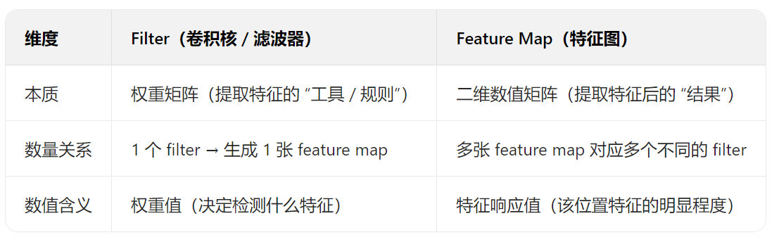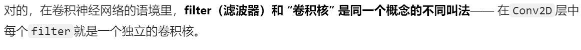 其实【卷积核】就是【filter】!!!!有的教材里喜欢叫 “卷积核”,有的会叫 “滤波器Filter”,但其实就是一个东西!!filter就是输出featuremap的工具,卷积核(filter工具)提取的特征值经过计算过滤,然后才投放到featuremap上作为结果
