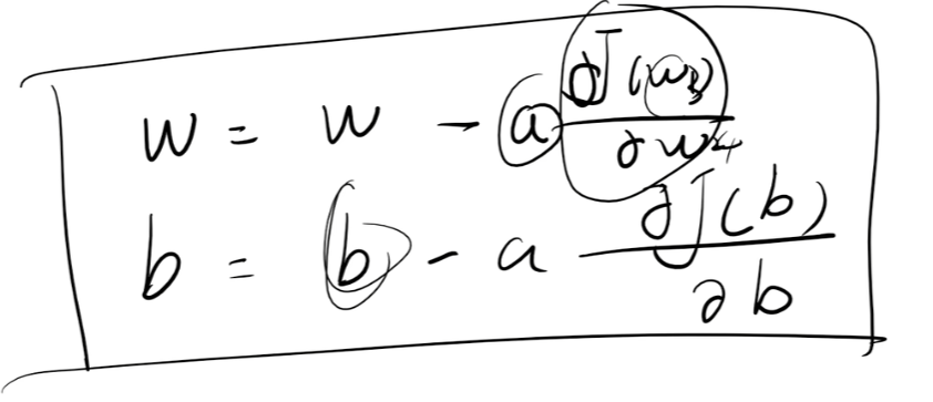 - 那就是用梯度下降算法,w = w - a * dJ(w)/dw、b = b - a * dJ(b)/db