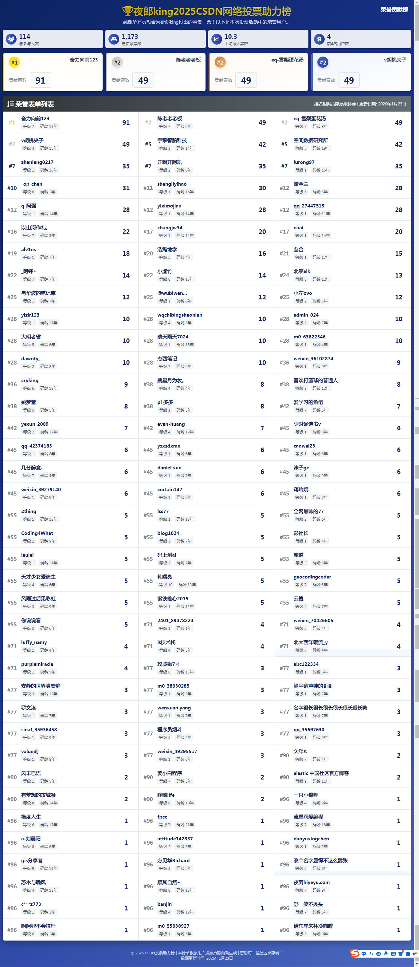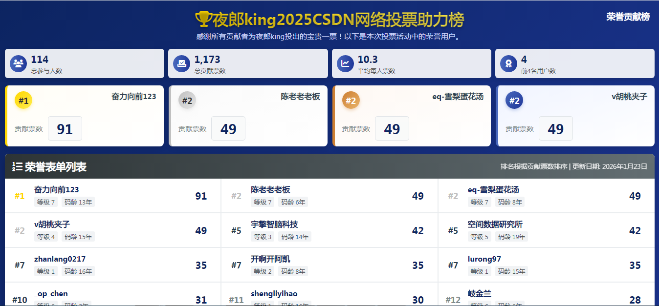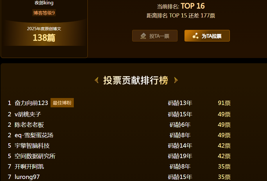 以上就是本文的主要内容,本文是夜郎king专程对2025博客之星网络评选的助力朋友的专程感谢,除了这些直接的助力,还有很多没直接投票,但也关心支持夜郎king的朋友,相信有了你们的支持,在接下来的日子中,我会更加坚定和努力。这场评选落幕了,但我选择用代码为记忆存档。以Java为笔、PostgreSQL为卷,将五百多份助力郑重写入数据表——每一次查询都是对善意的重读,每一行记录都是时光的拓片。当看到可视化图表上星罗棋布的支持点亮成一片星河,我深知这不仅是技术实现,更是一次情感的持久化Commit。这份温暖已落盘、已归档、已刻入持久存储,成为我永不Rollback的前行动力。谢谢你们,让冰冷的代码有了温度,让每一个事务提交都成了感恩的见证。未来长路,携此星光,继续奔赴。