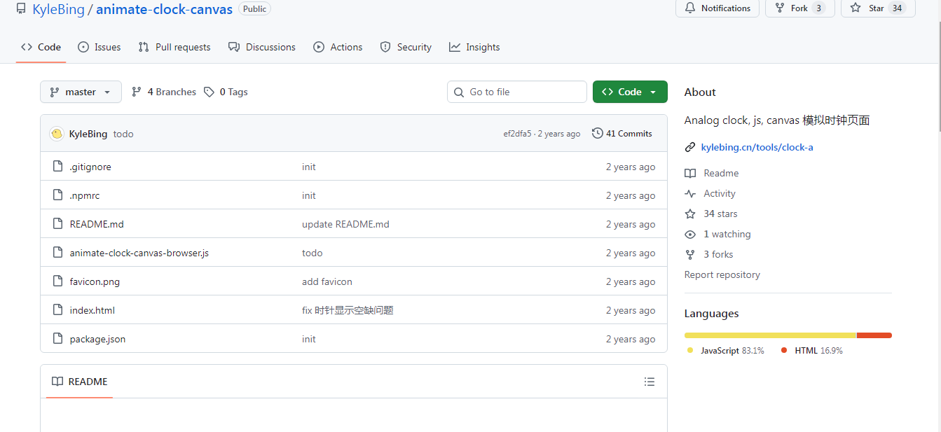 感兴趣的可以在Github上找到它的开源地址,animate-clock-canvas。在浏览器中输入地址后可以看到地址,虽然目前star数不是很多,但效果还是不错的。