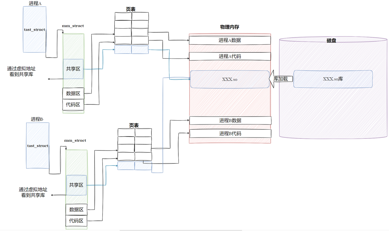 - 代码段共享:动态库的代码段(.text)是只读的,多个进程的页表会将虚拟地址映射到同一份物理内存的代码段。进程执行动态库函数时,直接读取这份共享的代码,无需复制。