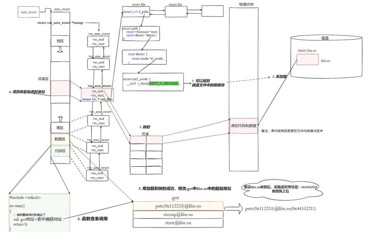 vm_area_struct,并更新页表,将动态库的虚拟地址映射到物理内存(或磁盘文件,采用 “按需加载” 策略)。