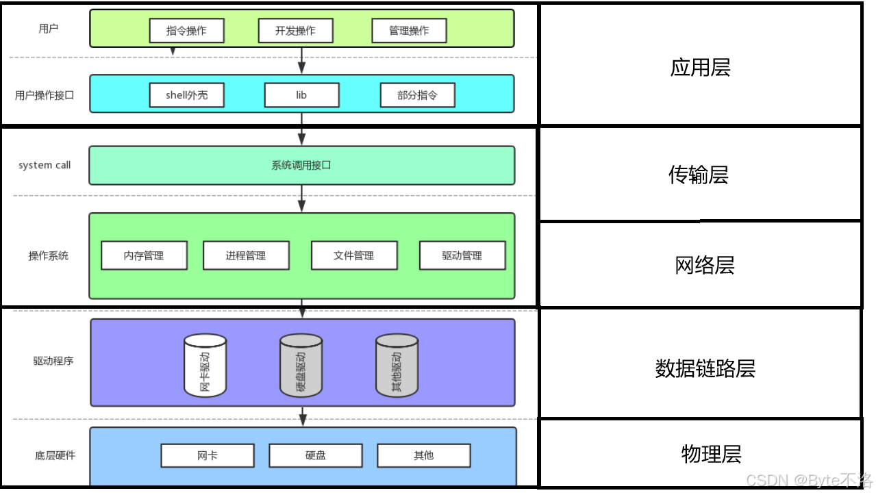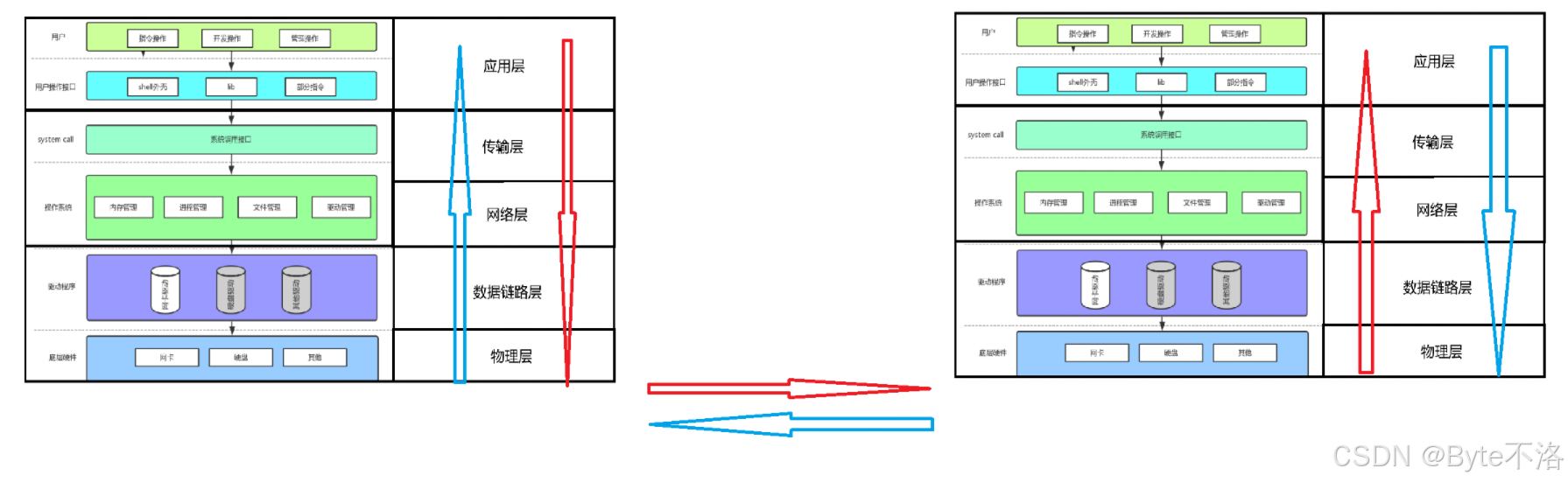 这也就是网络协议和我们的操作系统的对应关系就是这样的,在进行网络通信的时候,物理层就是我们操作系统中对应的底层硬件网卡,我们想要发送的数据,都是通过网卡进行发送,而数据链路层就相当于网卡的驱动程序,而传输层和网络层则是正真的在Linux内核中有具体实现,而我们想要直接访问网卡可能吗?当然不会,操作系统是软硬件的管理者,所以我们只能通过操作系统才可以访问网卡,简而言之,就是我们想要进行网络通信,就得通过系统调用接口,从而贯穿整个网络协议,这样才能够访问到网卡,进而进行网络通信。