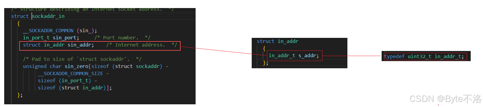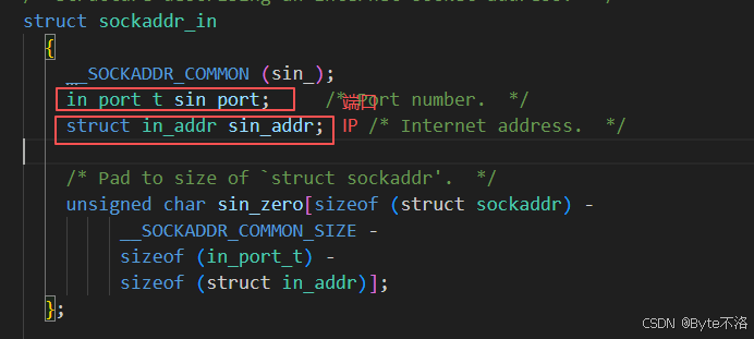 这样程序员就可以将IP和端口填入这个结构体中,从而可以使得我们的程序可以进行网络通信。
