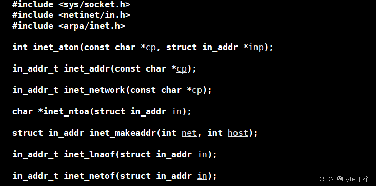 同时我们看到在sockaddr_in中关于IP和端口分别使用的是uint32_t和uint16_t的整形类型,而我们一般情况访问服务器的时候都是通过字符串进行访问的,比如像访问192.168.10.3:8080这样的地址,其中对于端口号,我们可以很轻易的直接通过atoi这样的接口将其转化为整形,而对于像IP地址这样点分十进制的方式进行访问,所以我们需要将这个点分十进制的表示形式转化为uint32_t的整形类型,对于这个常见的转化,系统中已经有对应的接口供我们使用,就是如下的接口: