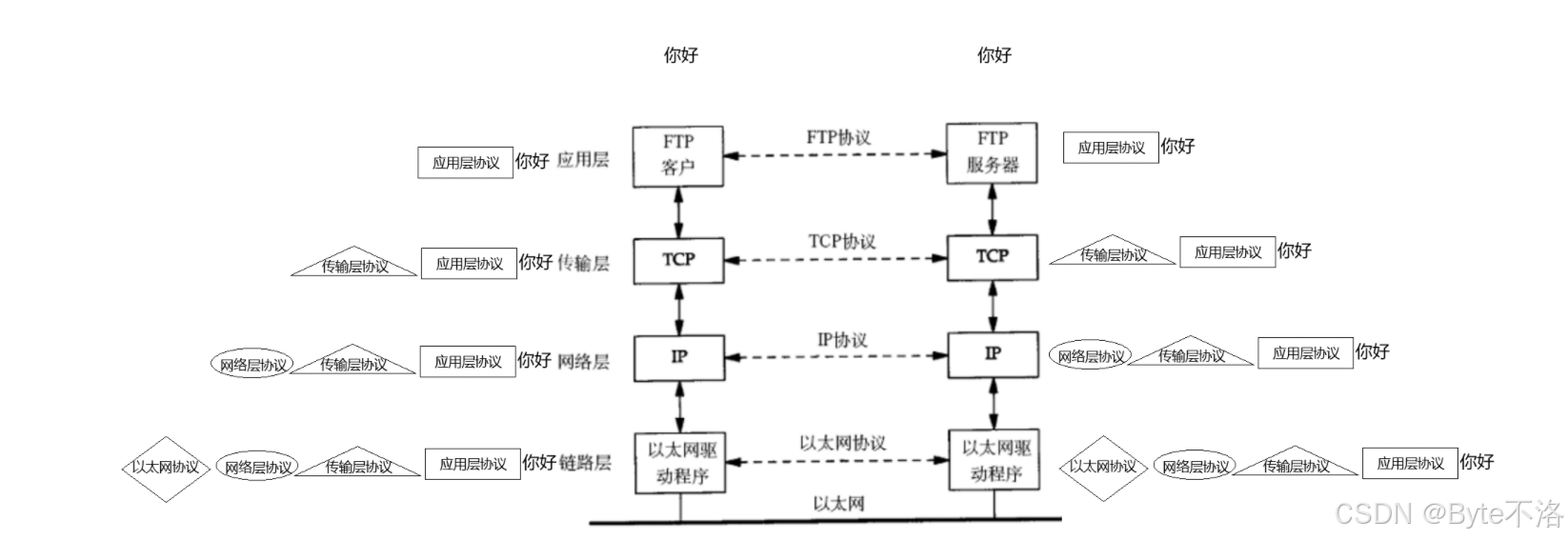 由图可知,我们的网络协议栈的层状结构中,每一层都有协议,所以现在假如我们想要给另一个电脑发送一个你好,在应用层,会在你好这个有效数据前增加应用层协议,在传输层中,会在应用层的基础上,增加传输层协议,在网络层会增加网络层协议等等,到了另一台主机之后,会将这些协议一一拆解,在链路层,会将以太网协议清除,将剩下的数据交给网络层,同样的,在网络层,会将网络层的协议进行拆除,将剩下的数据在交给传输层,就这样一一往上拆解交付,最后另一天主机就可以接收到你好这个数据了。
