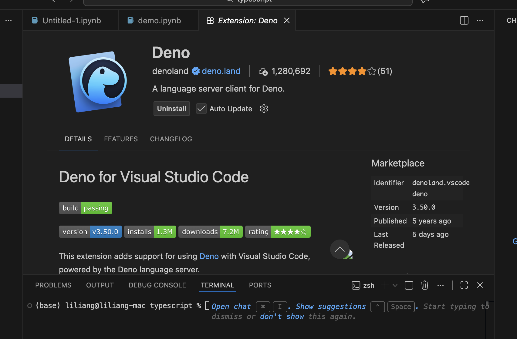 然后点击如下链接,安装deno插件Deno for Visual Studio Code