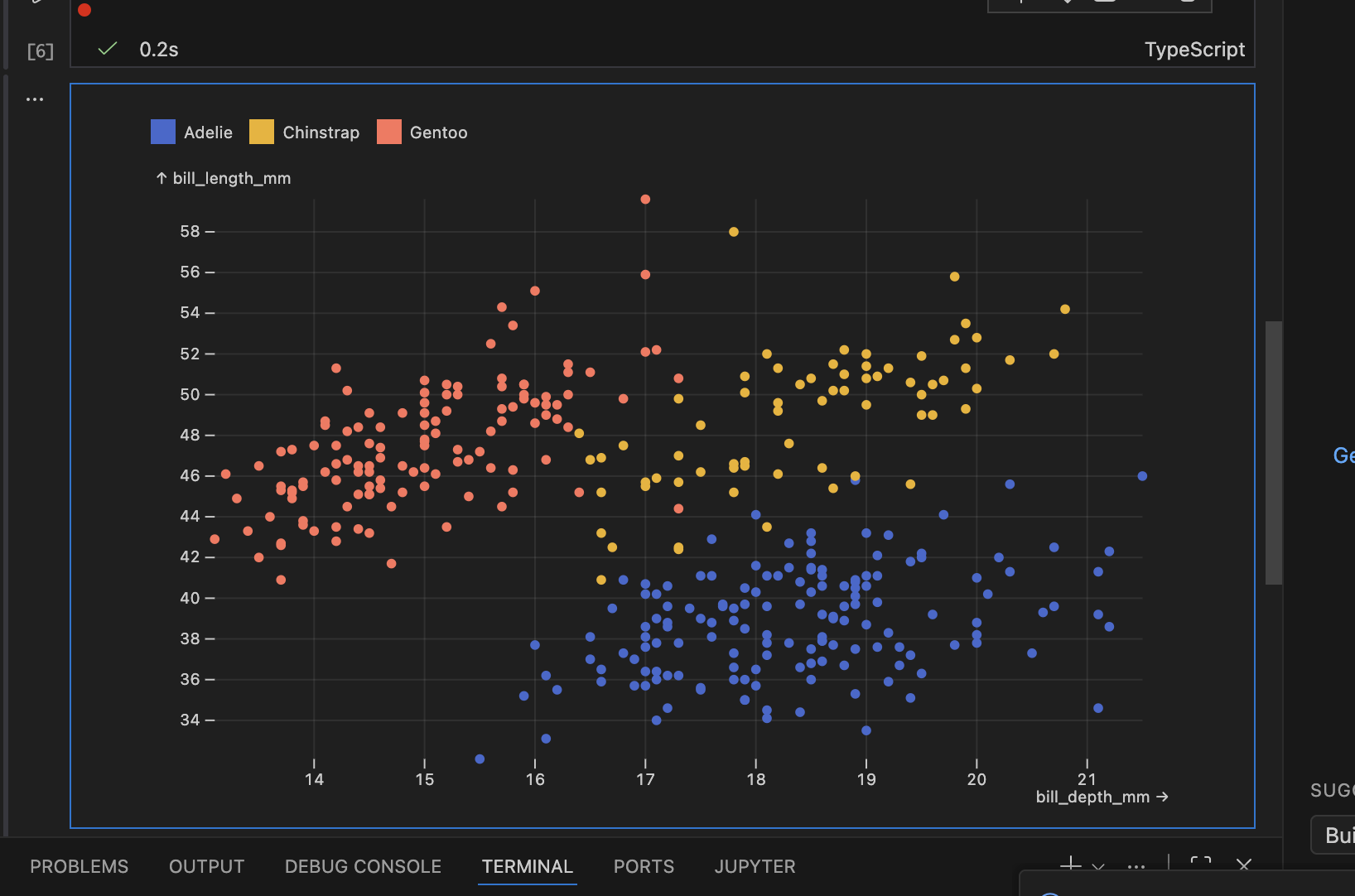 在jupyter中可视化输出如下所示,将三种不同企鹅的size数据以散点图形式呈现。