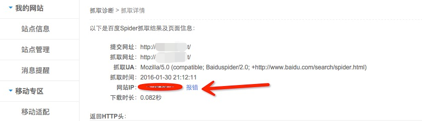 在我们更换 IP 之后,当使用百度抓取诊断工具发现 IP 未变更时,我们可以如图点击【报错】,让百度刷新 DNS 缓存: