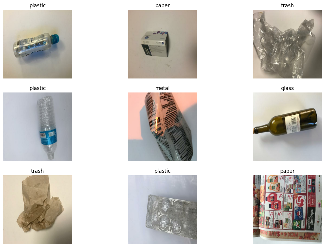 数据可视化是理解垃圾分类数据集特征的重要步骤。垃圾图像通常包含多样的形态、颜色和背景,直观检查样本图像有助于了解数据的复杂性、验证标签准确性,并为后续的模型设计和数据增强策略提供参考。本节从训练集中随机抽取一个批次,展示其中的9个样本图像及其对应的垃圾类别标签。