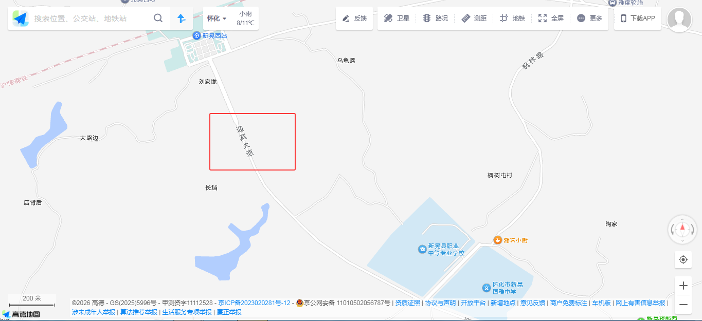 新晃西站至沙湾大桥路段是新晃县重要的交通干道,衔接沪昆高铁新晃西站与城区主干道,于2021年完成交工验收,后经地方政府命名为“迎宾大道”(起于沙湾大桥与320国道交汇处,止于新晃高铁西站),于2026年1月正式发布道路命名公告。该路段既是县域交通枢纽,也是城乡结合部道路的典型代表,其标注情况能较好反映县域道路地图标注的普遍问题,因此选取该路段作为本次实测分析的对象。