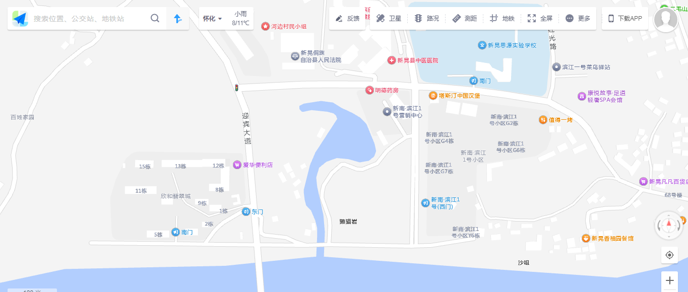 标注细节:道路走向与实地匹配,能准确呈现新晃西站至沙湾大桥的道路轮廓,无路线偏差;但道路名称标注与现状不符,仅能通过周边POI(如新晃西站、沙湾大桥)判断道路范围;道路线条颜色与周边道路明显区分。