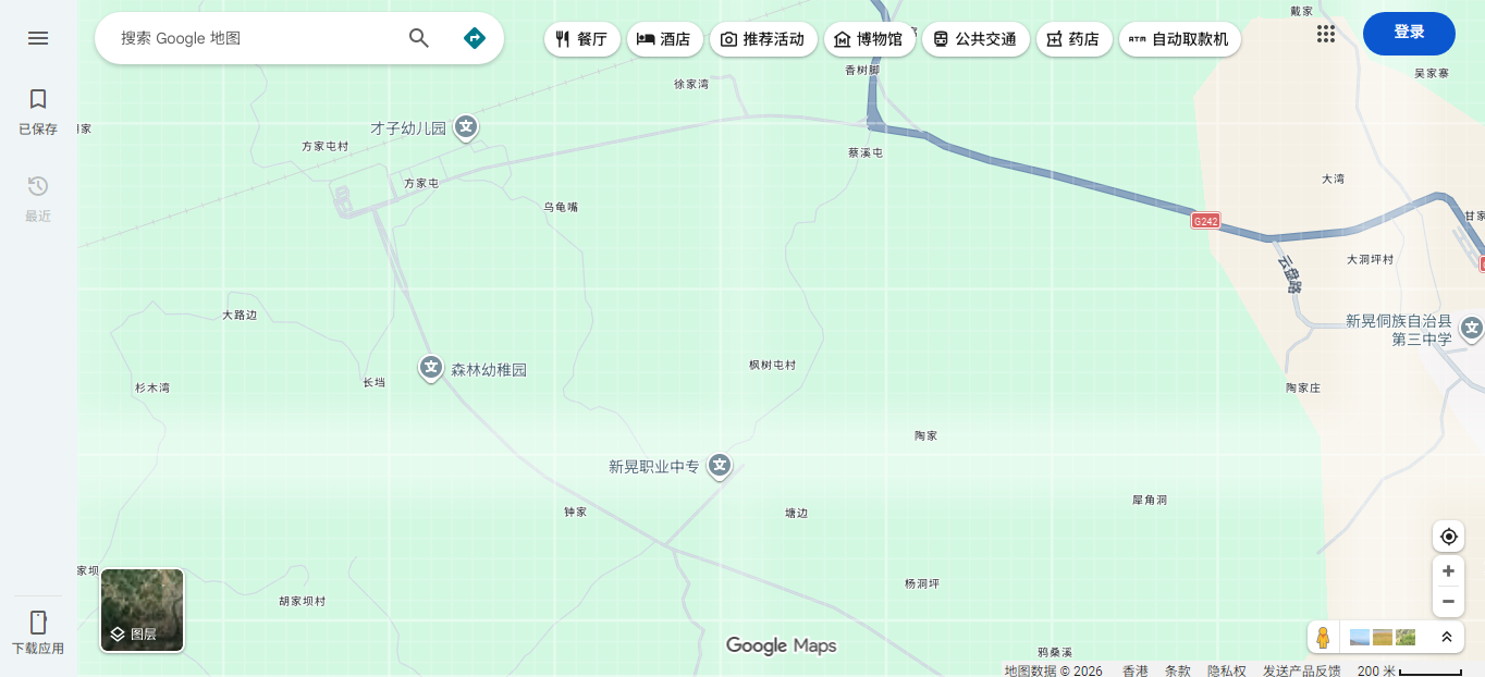 标注细节:道路走向与实地基本匹配;道路名称标注无中文名称;周边POI标注较少,仅能识别新晃西站、沙湾大桥等大型地标,小型POI缺失。