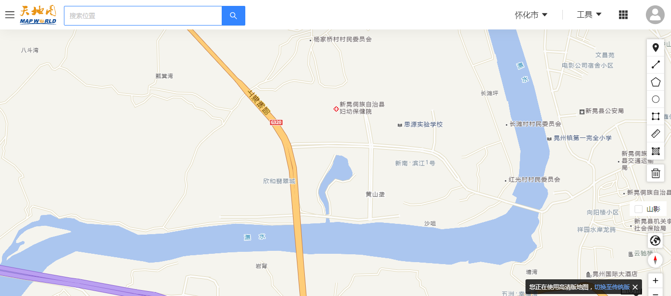 标注细节:道路走向与实地匹配,能准确呈现新晃西站至沙湾大桥的道路轮廓,无路线偏差;但全程未标注任何道路名称,仅能通过周边POI(如新晃西站、沙湾大桥)判断道路范围;道路线条颜色与周边道路无明显区分。将地图放大后依然无道路名称显示,如下图: