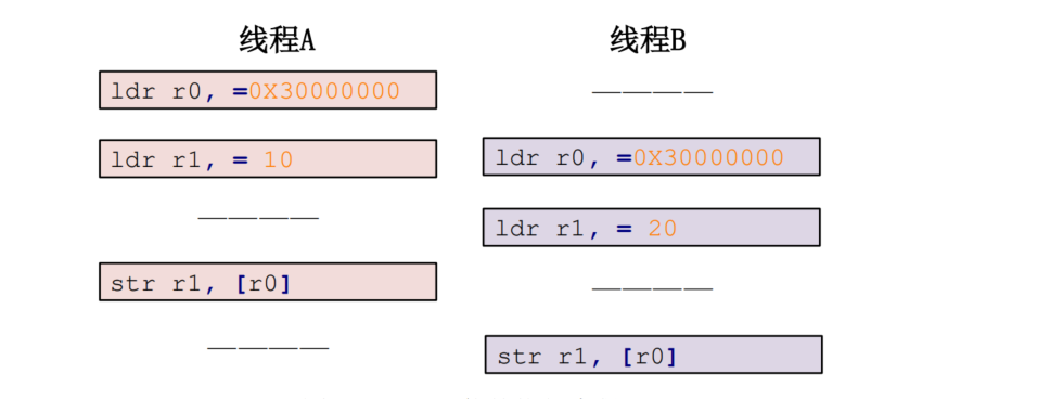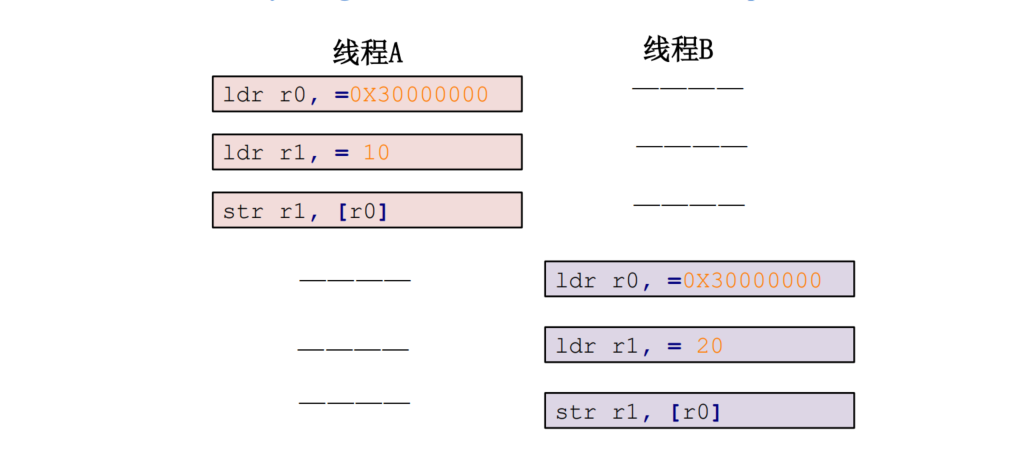 如果线程A要给a赋值10,线程B要给a赋值20,理想中的执行顺序如下图所示: