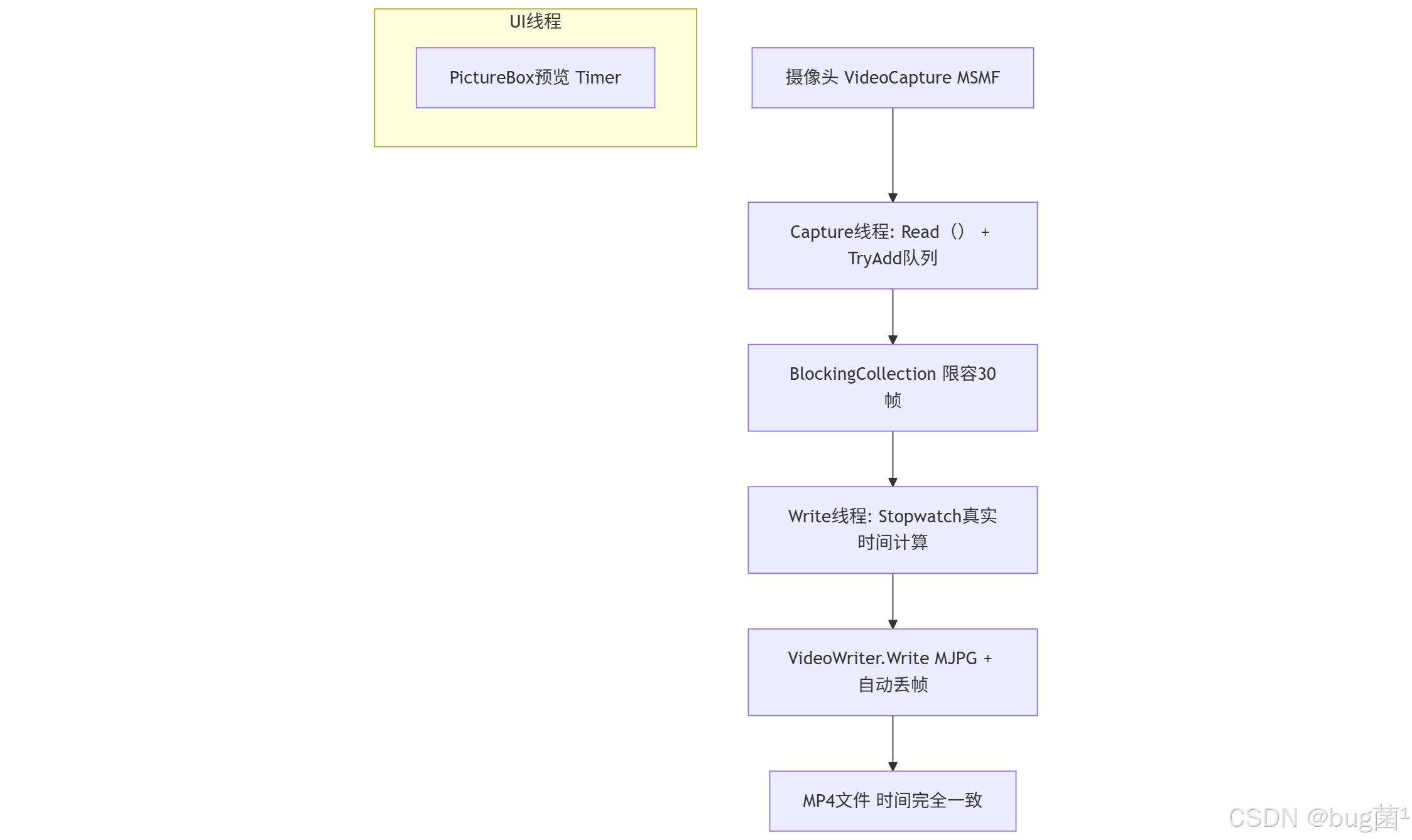 原理:把“读取”“处理”“写入”彻底解耦!主UI线程只负责预览,Capture线程以最大速度抓帧入队列,Write线程根据Stopwatch真实时间决定写入多少帧(自动丢帧保持实时),彻底解决“读取慢+写入阻塞”问题。使用BlockingCollection<Mat>保证线程安全 + 内存可控。