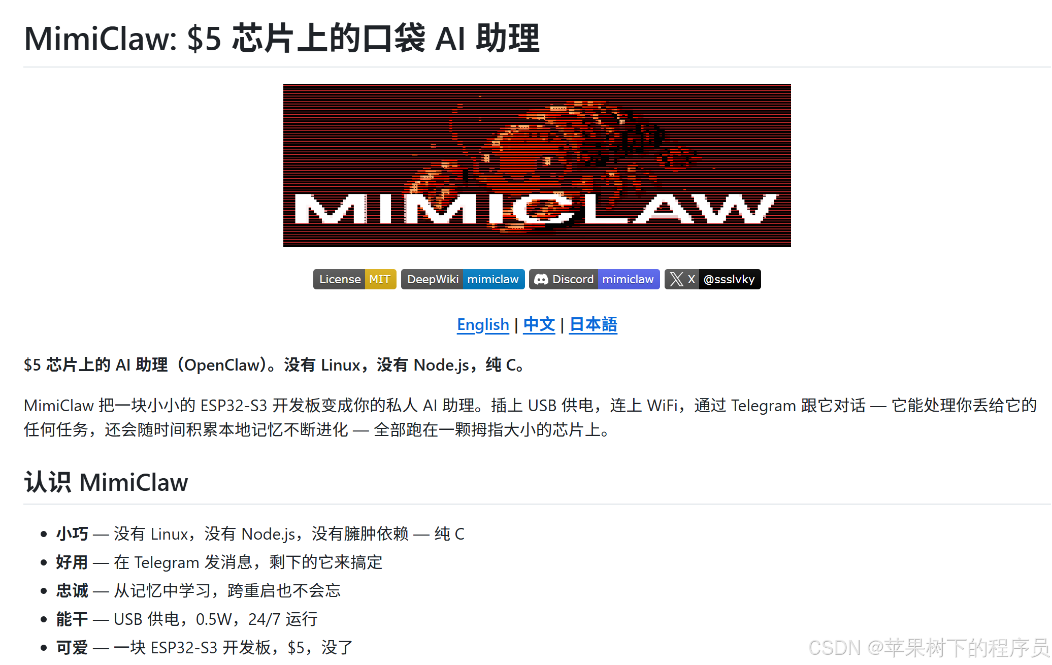 mimiclaw/README_CN.md at main · memovai/mimiclaw