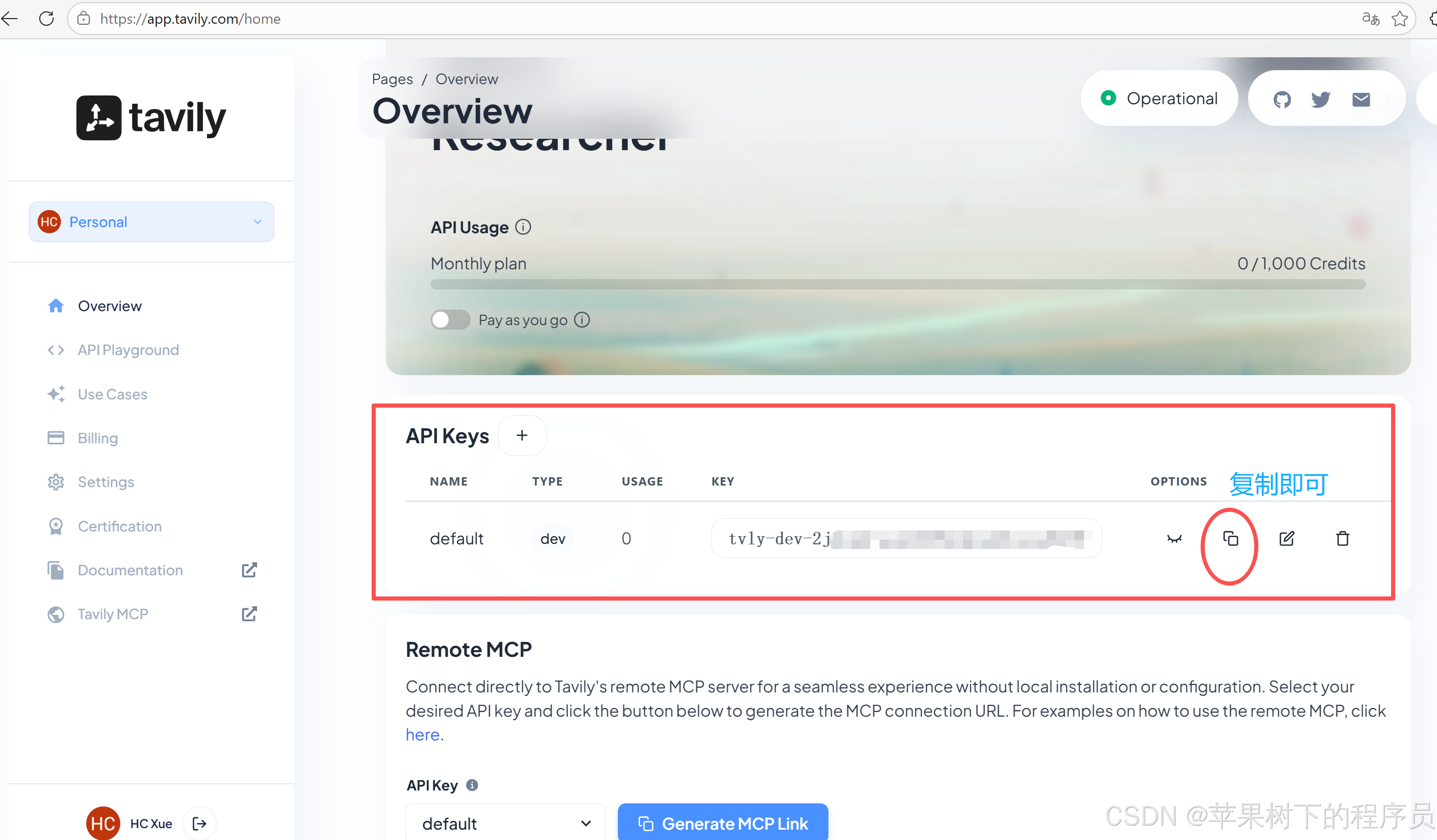 官方推荐使用Tavily API key,其官网: Tavily API 平台 https://app.tavily.com/home,